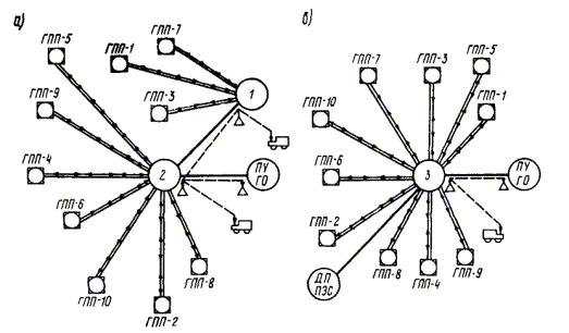 Черт. 3. Варианты организации каналов связи для систем централизованного управления
