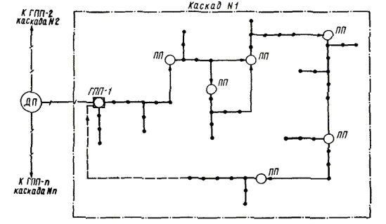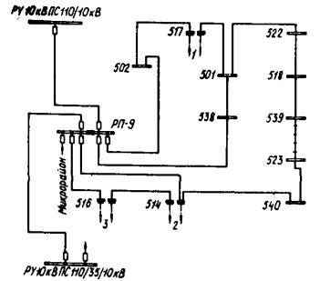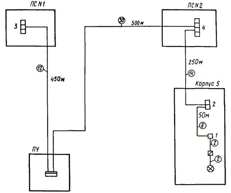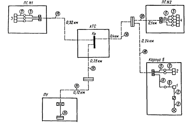 Черт. 3. Пример структурной схемы сети дистанционного управления наружным освещением промышленного предприятия с использованием резервных жил телефонных кабелей внутризаводской связи
