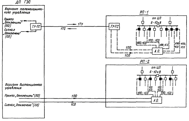 Черт. 2. Структурная схема организации диспетчерской и технологической связи при централизованном телемеханическом отключении линий 6 - 10 кВ в ЦП и РП Условные обозначения