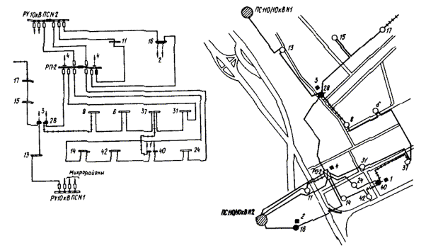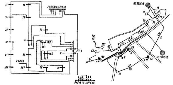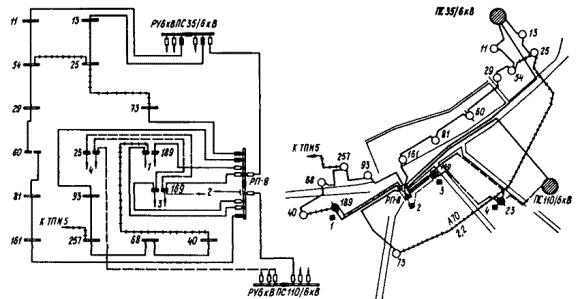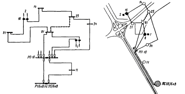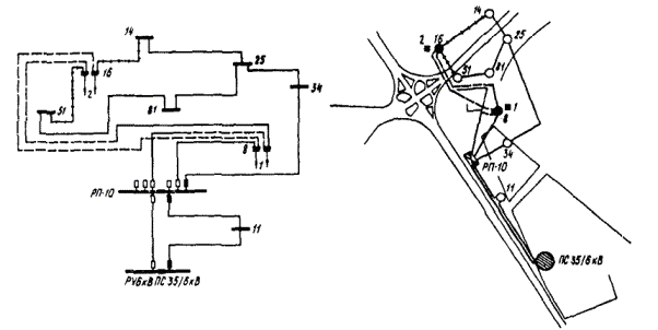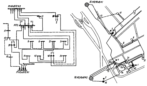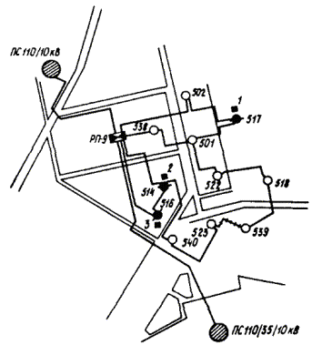 ПРИЛОЖЕНИЕ 9ПРИМЕРЫ ВЫПОЛНЕНИЯ РЕКОНСТРУКЦИИ ЭЛЕКТРИЧЕСКИХ СЕТЕЙ ОТДЕЛЬНЫХ УЧАСТКОВ ГОРОДСКОЙ ЭЛЕКТРОСЕТИ1. На черт. 1, 3 приведены из реальных проектов участки сети в категорированных городах, а на черт. 5, 7 - в некатегорированных, на черт. 2, 4, 6, 8 показаны упомянутые участки сети, реконструированные в соответствии с требованиями ГО по светомаскировке. 2. Реконструкция сети выполнена с соблюдением принципа разделения сети на отключаемую и неотключаемую с присоединением к последней всех потребителей, продолжающих работу в режиме ПЗ. 3. Потребителей, продолжающих работу в режиме ПЗ, рекомендуется присоединять к двум территориально несовмещенным центрам питания (для некатегорированных городов присоединение можно выполнить к двум разным секциям 10 (6) кВ одного ЦП) посредством взаиморезервируемых линий 10 (6) кВ, проложенных, как правило, по разным трассам (при невозможности прокладки по разным трассам допускается прокладка в разных траншеях). Соблюдение этих условий обеспечивает достаточную надежность электроснабжения и позволяет ориентироваться на передвижные автономные источники питания, а применение автономных источников стационарного типа целесообразно для потребителей, где они необходимы и в мирное время. Черт. 1