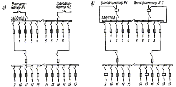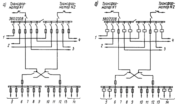 ПРИЛОЖЕНИЕ 10ПРИМЕРЫ ВЫПОЛНЕНИЯ СХЕМ ВНУТРЕННЕГО ЭЛЕКТРОСНАБЖЕНИЯ ОБЪЕКТОВ, ПРОДОЛЖАЮЩИХ РАБОТУ В РЕЖИМЕ ПЗ1. Объекты, продолжающие работу в режиме ПЗ, присоединяются к двум трансформаторам неотключаемой ТП 10 (6)/0,4 кВ (черт. 1 - 4) или к двум неотключаемым ТП (черт. 5). 2. Коммутационные аппараты, установленные в распределительных устройствах 0,4 кВ трансформаторных подстанций или у потребителей и подлежащие отключению в режиме ПЗ, должны отключаться централизованно из пункта управления объекта; допускается их местное отключение ответственным дежурным персоналом в установленное время. Дистанционное отключение автоматического выключателя осуществляется посредством встроенного в выключатель независимого расцепителя. 3. В случаях, когда в распределительных устройствах 0,4 кВ ТП 10 (6)/0,4 кВ затруднена установка коммутационных аппаратов с дистанционным отключением, допускается их установка на вводе к потребителям, прекращающим работу в режиме ПЗ. 4. Передвижные автономные источники при необходимости могут присоединяться посредством шланговых кабелей к вводному распредустройству 0,4 кВ потребителя после отсоединения питающих линий. 5. В помещениях, где предусматривается введение маскировочного освещения, все остальные осветительные приборы в режиме ПЗ отключаются. Черт. 1. Больница а - существующая схема; б - рекомендуемая схема; 1 - инфекционный корпус; 2 - хозяйственный корпус; 3 - терапевтический корпус; 4 - административный корпус; 5, 14 - палаты; 6 - рентгеновский кабинет; 7, 12 - отделения реанимации; 8, 11 - операционные; 9, 10 - резерв