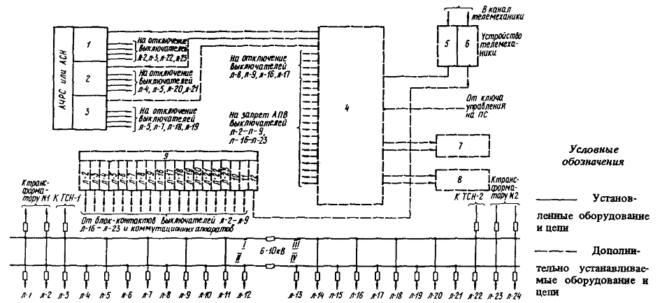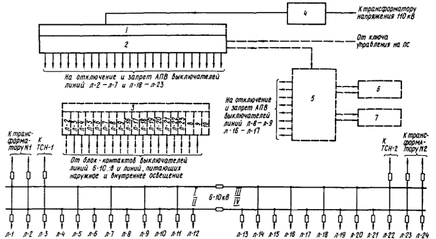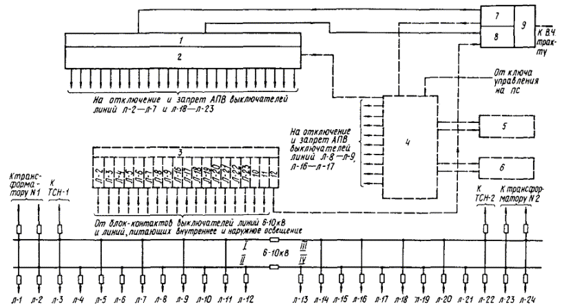 Черт. 3. Блок-схема централизованного управления коммутационными аппаратами линий 6 - 10 кВ и линий освещения подстанций с использованием установленной аппаратуры ЛЦР 1 - устройство автоматической циркулярной разгрузки (АЦР); 2 - реле отключения и запрета АПВ линий 6 - 10 кВ; 3 - устройство сигнализации; 4 - приемное устройство АЦР; 5 - реле отключения и запрета АПВ коммутационных аппаратов линий 6 - 10 кВ и освещения; 6 - коммутационные аппараты наружного освещения; 7 - коммутационные аппараты внутреннего освещения; 8 - наружное освещение; 9 - внутреннее освещение; 10 - общий сигнал Условные обозначения