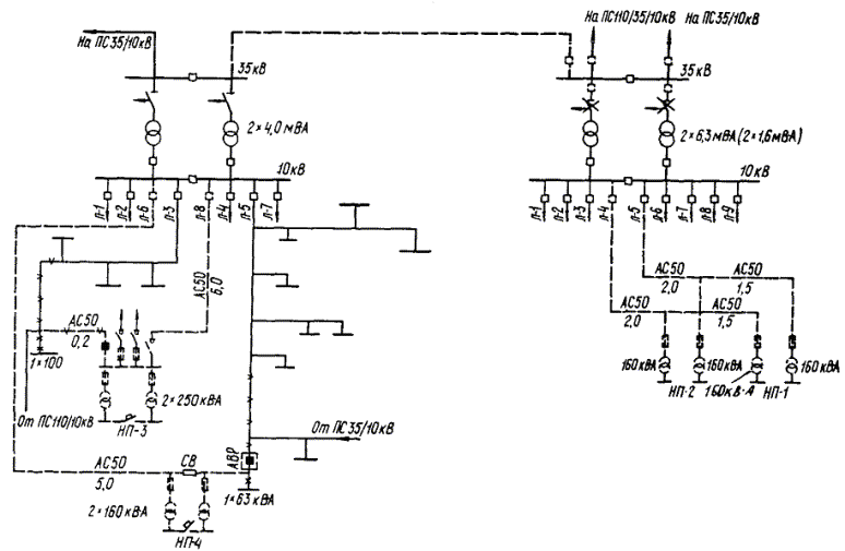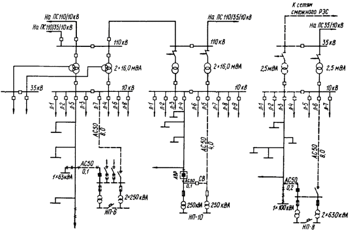 Черт. 2. Варианты преобразования действующих схем 6 - 10 кВ неотключаемых потребителей в рекомендуемые ПРИЛОЖЕНИЕ 13ПРИМЕРЫ РЕКОНСТРУКЦИИ СЕЛЬСКИХ ЭЛЕКТРИЧЕСКИХ СЕТЕЙ 10 - 110 кВЧерт. 1. Схема электрических соединений сетей 10 - 35 - 110 кВ неотключаемых потребителей с учетом объемов реконструкции Черт. 2. Схема электрических соединений сетей 10 - 35 кВ неотключаемых потребителей с учетом объемов реконструкции Условные обозначения к черт. 1, 2