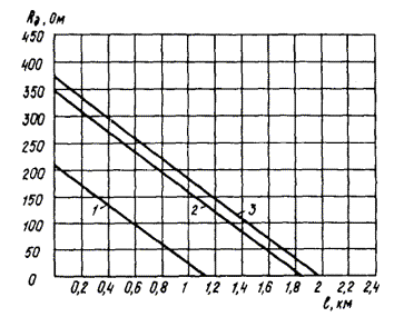 ПРИЛОЖЕНИЕ 14РАСЧЕТ СЕТЕЙ УПРАВЛЕНИЯ И СИГНАЛИЗАЦИИ ВНУТРЕННЕГО И НАРУЖНОГО ОСВЕЩЕНИЯРАСЧЕТ СЕТИ УПРАВЛЕНИЯ И СИГНАЛИЗАЦИИ ПРИ ИСПОЛЬЗОВАНИИ ТЕЛЕФОННЫХ КАБЕЛЕЙ 1. При небольшой протяженности линий дистанционного управления, когда потери напряжения в сети не превышают допустимой величины (15 %), напряжение источника питания, катушек реле и сигнальных ламп принимается одинаковое (60 В). В таких случаях потери напряжения в сети управления e, %, выполненной телефонными кабелями с медными жилами диаметром 0,5 мм, рекомендуется определять по формуле: e = 269Il, (1) где I - рабочий ток катушек реле или сигнальной лампы, А; l - длина кабеля от пульта (щитка) управления до силового блока, км. 2. При равенстве номинальных напряжений источника питания сети управления, катушек реле и сигнальных ламп, указанные на черт. 2 Пособия добавочные сопротивления R1 и R2 в цепях катушек реле и сигнальных ламп не требуются. 3. При большой протяженности линий дистанционного управления потери напряжения в линии, рассчитанной как указано в п. 14.1, могут оказаться больше максимально допустимой величины (15 %) и в таких случаях напряжение катушек реле и сигнальных ламп принимается ниже напряжения источника питания, например, реле и сигнальная лампа - на 48 В при напряжении источника питания 60 В и т.д. 4. В случаях, указанных в п. 3, расчет сети управления и сигнализации сводится к определению величины добавочного сопротивления, включаемого последовательно с катушкой или лампой для гашения излишка напряжения, не потерянного в кабеле. При питании одной парой медных жил диаметром 0,5 мм, обычно применяемых для телефонных кабелей, одного реле или одной сигнальной лампы, величина добавочного сопротивления (R1 и R2 на черт. 2) определяются по формуле: Rд = U/0,85I - 190l - R, (2) где Rд - добавочное сопротивление, Ом; R - активное сопротивление катушки реле или сигнальной лампы (при ее горении), Ом; U - напряжение источника питания, В; I - рабочий ток катушки реле или сигнальной лампы (при ее горении), А; l - длина кабеля от пульта (щитка) дистанционного управления до силового блока, км. 5. Для упрощения расчетов величины добавочных сопротивлений в цепи катушки реле типа РПУ-2 постоянного тока и коммутаторных ламп (обычно применяемых в таких схемах) служат графики на черт. 1, 2. Черт. 1. График для определения величины добавочного сопротивления в цепи катушки реле РПУ-2 постоянного тока (при сопротивлении катушек, Ом: 12 В - 43; 24 В - 180; 48 В - 800) Напряжение источника питания сети управления 60 В. Напряжение реле: 1 - 12 В; 2 - 24 В; 3 - 48 В; Rд - добавочное сопротивление в цепи катушки реле, Ом; l - длина кабельной линии управления с медными жилами диаметром 0,5 мм Черт. 2. График для определения величины добавочного сопротивления в цепи коммутаторных ламп Напряжение источника питания цепи сигнализации 60 В. Тип и напряжение коммутаторных ламп: 1 - КМ 12-90, 12 В; 2 - КМ 24-35, 24 В; 3 - КМ 24-90, 24 В; 4 -КМ 48-50,48 В; Rд - добавочное сопротивление в цепи сигнальной лампы, Ом; l - длина кабельной линии сигнализации с медными жилами диаметром 0,5 мм, км РАСЧЕТ СЕТИ УПРАВЛЕНИЯ ПРИ ИСПОЛЬЗОВАНИИ КОНТРОЛЬНЫХ КАБЕЛЕЙ 6. Сечение жил контрольных кабелей при питании катушек магнитных пускателей (контакторов) и реле переменным током определяется по формуле: S = Ilb, (3) где S - сечение, мм2; I - пусковой ток катушки магнитного пускателя (контактора) или реле, А; l - длина кабеля от пульт