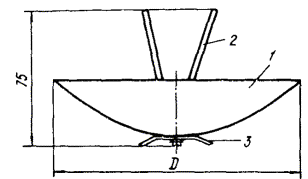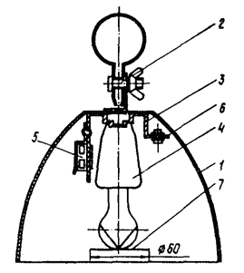 2. Светильники НО-300, СПО-200, СПО-2 ´ 200, СПП-200М, НСУ04-200-001-У1, РСУ-04-125-001-У1, ОСТ.160.535.047-79 с приспособлениями типа ЗСУ.564.004 предназначены для освещения улиц, дорог, проездов и заводских территорий. Светильники имеют литой силуминовый или штампованный диффузный отражатель. Призматический преломлятель или рассеиватель крепится винтами к основанию корпуса. При переводе светильников на работу в режиме ПЗ необходимо: все стеклянные рассеиватели и преломлятели снять и заменить приспособлениями (черт. 2). Крепление металлических приспособлений аналогично креплению стеклянных преломлятелей и рассеивателей; ввинтить окрашенную лампу. Тип и мощность лампы указаны в табл. 4 Пособия. Технология окраски ламп дана в прил. 17. Черт. 2. Приспособление ЗСУ 564.004 Черт. 3. Приспособление ЗСУ 564.005 3. Светильники СПОР-250, СПО-500 ОСТ.16 0535.047-79 с приспособлениями ЗСУ 564.005 предназначены для освещения улиц, дорог, проездов. Корпус светильника изготовлен из алюминиевого сплава. Внутри корпуса крепится ламповый патрон и дроссель. Рассеиватель из молочного стекла крепится к основанию корпуса тремя скобами. При переводе светильников на работу в режиме ПЗ необходимо: все стеклянные рассеиватели снять и заменить приспособлениями (черт. 3). Способ крепления металлических приспособлений такой же, как и рассеивателей; ввинтить переходной патрон Е40/Е27; произвести пересоединение проводов питающей сети, исключив из схемы пускорегулирующую аппаратуру; ввинтить окрашенную лампу мощностью 15 - 25 Вт. В процессе эксплуатации производить общий профилактический осмотр светильника с приспособлением и его деталей, проверять надежность электроконтактов. Не допускать образования ржавчины на светильнике и приспособлении. Вышедшие из строя лампы заменять лампами той же мощности. СВЕТИЛЬНИКИ, РЕКОМЕНДУЕМЫЕ ДЛЯ ВНУТРЕННЕГО МАСКИРОВОЧНОГО ОСВЕЩЕНИЯ, И МАСКИРОВОЧНЫЕ ПРИСПОСОБЛЕНИЯ К НИМ 4. Светильники Гс-500М, Гс-1000М, Гс-1500М предназначены для общего освещения производственных помещений с нормальными условиями среды. Светильники ГсУ-500М, ГсУ-1000М, ГсУ-1500М предназначены для общего освещения промышленных помещений с тяжелыми условиями среды: влажных, сырых и пыльных (с негорючей пылью). Светильники рассчитаны для работы от сети переменного тока напряжением 380/220 В частотой 50 Гц. Для работы светильников Гс и ГсУ в режиме ПЗ необходимо: снять лампу номинальной мощности; установить переходный патрон ПП-Е40/Е27П-03 по ТУ ОДТ.539.006-73; установить лампу мощностью 15 Вт при высоте подвеса светильника 6 м; надеть на лампу экранирующее устройство типа ЭУ-01УЗ (черт. 4), состоящее из экрана-отражателя 1, держателя 2, который надевается на лампу, и скобы 3. Замену ламп и установку экранирующего устройства производить при отключенном напряжении. Черт. 4. Габаритные, установочные размеры и масса экранирующего устройства ЭУ-01УЗ масса - 0,180 кг; 1 - экран-отражатель; 2 - держатель; 3 - скоба 5. Светильники серии НСП21 предназначены для освещения производственных помещений и рассчитаны на работу с лампами накаливания в сети переменного тока напряжением 380/220 В частотой 50 Гц. Для работы светильников серии НСП21 в режиме ПЗ необходимо заменить лампу номинальной мощности на окрашенную лампу типа В230-240-15. Замену ламп следует производить при отключенном напряжении. Окраску ламп накаливания производят в соответствии с инструкцией