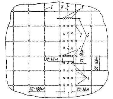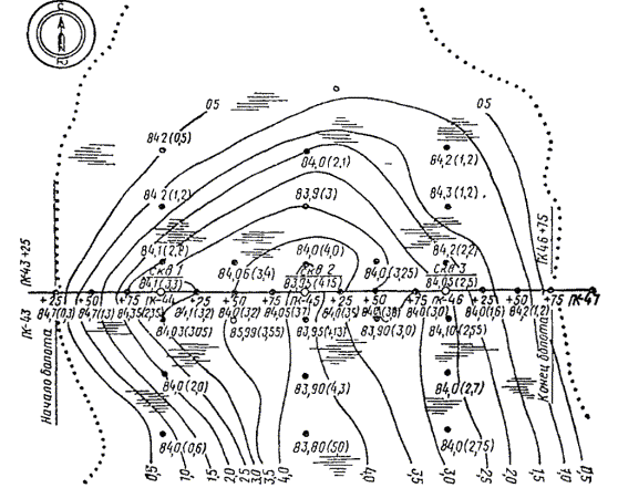 Рис. 1. План болота. Масштаб 1:2000 (Линии мощности торфа проведены через 0,5 м.) о - Скважина - 2/83,95 (4,15) - опорная скважина, ее номер, отметка устья, мощность (в скобках, м); · 83,80 (5,0) - зондированная скважина, отметка устья и мощность торфа (в скобках, м) геологические разрезы по оси вариантов трассы и по характерным поперечникам с нанесенными на них результатами определения основных показателей состава и состояния грунтов и механических испытаний грунтов в условиях природного залегания полевыми приборами (рис. 2); результаты лабораторных испытаний грунтов слабой толщи; пояснительную записку. Пояснительная записка должна содержать: подробное описание участка, включая его происхождение; источники питания грунтовых вод; состав и состояние грунтов слабой толщи; данные о растительно-корневом покрове, пнистости, наличии поверхностного водоотвода; данные о постоянных водотоках и о проходе весенних вод; данные о характере пород, слагающих дно толщи и о рельефе последнего. В пояснительной записке дают оценку строительных свойств слабых грунтов; выделяют расчетные (однотипные) участки, расчетные слои (т.е. слои единообразные по инженерно-геологическим свойствам) и дают расчетные значения механических характеристик грунтов для этих слоев. На основе количественной оценки механических свойств грунтов слабой толщи должна быть проведена предварительная оценка слабой толщи как основания насыпи. Пояснительная записка должна содержать также сведения о поведении и состоянии существующих дорог, расположенных в пределах данного участка, состоянии земляного полотна, конфигурации основания насыпи по данным бурения, качественной оценке грунтов тела насыпи, сведения о резервах грунта, намечаемых для использования при возведении насыпи на участке залегания слабых грунтов с указанием характеристик этих грунтов. 2.5. В результате обобщения всех данных обследования должно быть сделано заключение о принципиальной возможности или невозможности (нецелесообразности) использования слабой толщи в качестве основания и указаны конструкции, которые могут рассматриваться в качестве конкурирующих вариантов при дальнейшей разработке проекта. 2.6. Состав и объем работ, выполняемых при обследовании, методика их выполнения, применяемые способы определения свойств грунтов и аппаратура зависят от стадии проектирования и этапа изысканий. 2.7. Инженерно-геологическое обследование следует выполнять поэтапно. Этапы обследования различаются методикой определений и составом работ. При этом каждый последующий этап как по методике определений, так и по применяемому оборудованию и составу определений более сложен и трудоемок, чем предыдущий. В общем случае целесообразно выделять три этапа обследования: на первом (рекогносцировочном) лабораторных определений не выполняют; на втором лабораторные исследования ограничиваются определением показателей состава и состояния грунтов в полевой (нестационарной) лаборатории; на третьем выполняют испытания в стационарной лаборатории для определения показателей механических свойств грунтов. 2.8. В зависимости от конкретных условий проектирования указанные этапы могут быть распределены по стадиям проектирования. При двухстадийном проектировании (проект и рабочая документация) целесообразно первые два этапа обследов