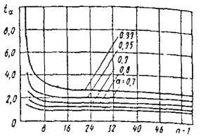 где tα - коэффициент Стьюдента, принимаемый по графику (рис. 5) в зависимости от заданной доверительной вероятности (коэффициента надежности) α и числа измерений; σ - среднее квадратическое отклонение; N - число измерений. Рис. 5. График для определения коэффициента Стьюдента tα при различной надежности α и количестве определений п При определении расчетных значений показателей состава и состояния величины tα, рекомендуется устанавливать при следующих коэффициентах надежности: