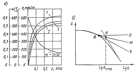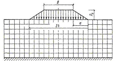 где Hi - мощность отдельного слоя; epzi - модуль осадки грунта этого слоя в вертикальном направлении, устанавливаемый по компрессионной кривой при нагрузке, отвечающей нормальному напряжению на уровне середины расчетного слоя и с учетом срока службы дорожной конструкции (см. прил. 7); epxi - то же, в горизонтальном направлении; μi - коэффициент бокового расширения грунта i-го слоя. 4.9. Для определения расчетного значения модуля осадки необходимо: установить расчетные напряжения от внешней нагрузки на данном горизонте по формуле σz = αpрасч, (34) где pрасч - расчетная нагрузка на поверхности основания; α - безразмерный коэффициент, зависящий от относительной глубины расположения рассматриваемого горизонта и определяемый в соответствии с прил. 6; определить расчетные напряжения от собственного веса толщи на данном горизонте σс.в = γсрz, (35) где γср - средневзвешенный удельный вес толщи, расположенный выше данного горизонта z; определить по компрессионной кривой вида epz = f(p) величину модуля осадки e′pz при нагрузке pz + σс.в; определить по той же компрессионной кривой модуль осадки е″pz при величине p, отвечающей структурной прочности σстр; вычислить расчетный модуль осадки как разность epz = e′pz - e″pz. (36) 4.10. Если осадка насыпи превышает 10 % высоты насыпи, то необходимо учитывать в расчете нагрузку от просевшей части насыпи. В этом случае расчет приходится вести методом последовательного приближения. Наиболее удобно этот расчет выполнять графическим способом в следующем порядке: задавшись величиной нагрузки p0 на поверхности толщи, определяют, пользуясь таблицами и графиками прил. 6, напряжения (pz - при одномерной задаче, pz и px - при двухмерной) в расчетных слоях по оси насыпи; по соответствующим компрессионным кривым находят модули осадки, отвечающие установленным напряжениям в соответствии с п. 4.9; по формулам п. 4.8 определяют осадки слоев и суммарную осадку; повторяют расчеты еще для двух-трех значений нагрузки p; по результатам строят графики осадки отдельных слоев и общей осадки в зависимости от нагрузки на поверхности; на этом же графике строят прямую, выражающую зависимость нагрузки на поверхности от осадки (по формулам п. 3.8). Точка пересечения построенных кривых полной осадки и прямой определит расчетную величину полной осадки и нагрузки на поверхности, точки пересечения с кривыми, построенными для отдельных слоев, определяют их частные осадки. 4.11. Если общая мощность слабой толщи не более 1,5bср (где bср - полуширина насыпи по средней линии), то при расчете осадки изменение по глубине сжимающих напряжений можно не учитывать. 4.12. Для приближенных расчетов при невысоких насыпях (до 5 м) и мощности слабой толщи не более 2b, когда отсутствуют данные непосредственных компрессионных испытаний, можно использовать значимость