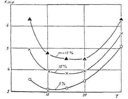 где kmφ - функция, определяемая по графику (рис. 9); m - максимально допустимый процент отклонения расчетной сопротивляемости грунта сдвигу от фактической в сторону завышения, принимаемый равным 5 - 10 %. Рис. 9. График зависимости kmφ = f(φ) при различных значениях m 3.15. При использовании в расчете полной условной сопротивляемости грунта сдвигу, устанавливаемой с помощью крыльчатки, для расчета pначбез в зависимости от условий, может использоваться любая формула табл. 18, относящаяся к случаю φ = 0. 3.16. При сложном поперечном сечении насыпи (насыпь с бермами, откосами разной крутизны и т.п.) определение pначбез следует вести путем анализа соблюдения условия прочности в различных точках основания по формуле
