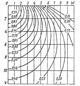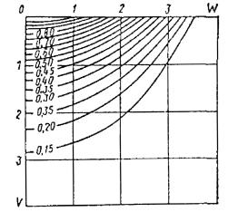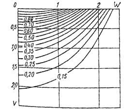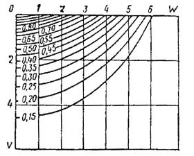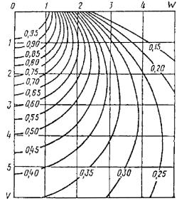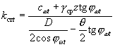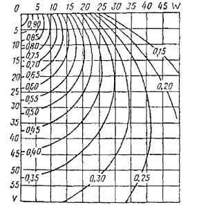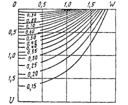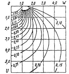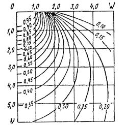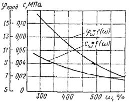 где cωt и φωt - сцепление и угол внутреннего трения, отвечающие влажности ω грунта в заданный момент t; D и θ - разность и сумма главных напряжений в данной точке, определяемые по графикам прил. 6. Значения cωt и φωt можно устанавливать по графикам cω = f(ω), φω = f(ω), получаемым в результате испытаний грунта на сдвиг по методу плотности и влажности. При этом расчетная влажность грунта в момент t определяется по формуле ωt = ωнач - (ωнач - ωкон)U, (23) где ωнач и ωкон - начальная и конечная влажности; U - степень консолидации в момент t, устанавливаемая по решениям плоской задачи теории консолидации. Для определения U и расчета kстt следует использовать специальную программу для ЭВМ. В этом случае применяют следующие аналитические выражения для функций cωt = f(ω) и φωt = f(ω):