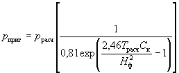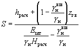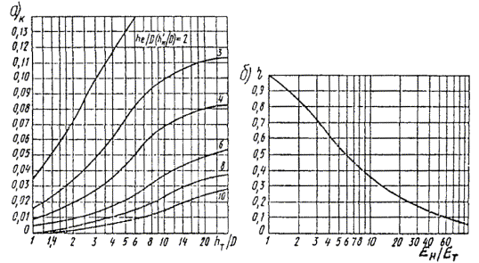 где hрасч - расчетная высота насыпи; γн и γвзвн - удельный вес грунта насыпи над и под уровнем грунтовых вод; zг.в - расстояние от поверхности основания до расчетного уровня грунтовых вод, Ешт - штамповый модуль деформации слабой толщи, принимаемый приближенно по табл. 3 основного текста; Hрасч - расчетная мощность слабой толщи. Величина расчетной мощности слабой толщи принимается в зависимости от отношения фактической мощности H к полуширине насыпи bср по средней линии: