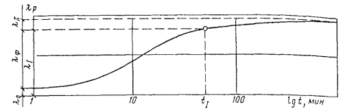 4.14. При проектировании дорог на торфяных болотах I типа глубиной до 4 м в порядке первого приближения величину осадки можно устанавливать по табл. 19. Прогноз хода осадки по времени4.15. При мощности активной зоны Ha ≤ bср (где bср - ширина насыпи по средней линии) прогноз длительности осадки может осуществляться по схеме одномерного сжатия. Прогноз хода осадки во времени целесообразно вести раздельно для двух участков кривой консолидации, называемых участками первичной и вторичной осадок (рис. 10). Рис. 10. Общий вид кривой консолидации λ0 - мгновенная осадка, λI - первичная осадка, λII - вторичная осадка 4.16. На участке первичной осадки время достижения реальным слоем относительной деформации λ при нагрузке p осуществляют упрощенным или более точным способом. В первом случае время интенсивной части деформации определяется (на основе неполного объема испытаний слабого грунта) по формуле