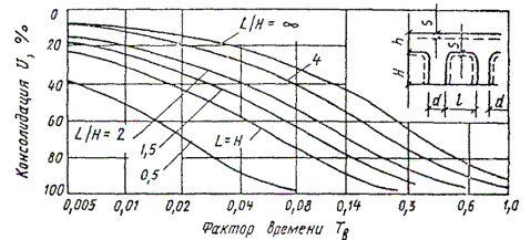 где D - эффективный диаметр дренирования (принимается равным расстоянию между дренами); γв - удельный вес воды в порах; I0 - начальный градиент фильтрации грунта с учетом уплотнения весом насыпи (при отсутствии лабораторных данных принимают для торфа I0 = 2; для ила и глины I0 = 5); pрасч - нагрузка на основание от насыпи проектного сечения; γпр - удельный вес грунта, используемого для пригрузки. 5.25. Вертикальные дрены выполняют в виде скважин, заполняемых песком. Диаметр скважин должен быть от 40 до 60 см с учетом технических параметров применяемого оборудования. Для заполнения вертикальных дрен применяют песок с коэффициентом фильтрации 6 м/сут. Эффективность вертикальных дрен значительно повышается при добавке к материалу заполнения 5 - 18 % (по массе) извести. При применении вертикальных дрен насыпь или ее нижнюю часть толщиной не менее 50 см следует устраивать из дренирующих грунтов с коэффициентом фильтрации не менее 3 м/сут. В зависимости от водопроницаемости грунта и требуемого срока стабилизации осадки расстояние между дренами изменяется от 2 до 4,5 м. 5.26. Предварительную оценку влияния дрен на срок стабилизации осадки можно провести по формуле