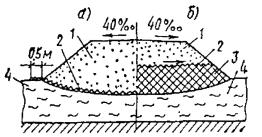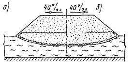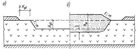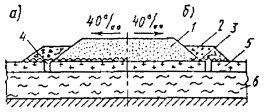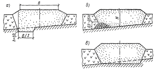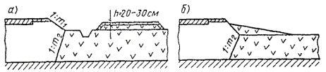 где pc и pг - давление от насыпи на сваю и слабый грунт; φc и cc - угол внутреннего трения и сцепление грунта, образующего сваю; m - сближение свай. Пример расчета насыпи с песчаными сваями дан в прил. 14. 5.56. Грунтовые сваи могут предназначаться для уменьшения осадки основания. В этом случае подбирается сближение свай, обеспечивающее снижение осадки до заданной величины. Уменьшение осадки основания учитывается также при применении грунтовых свай для обеспечения устойчивости. При мощности слабой толщи не более ширины насыпи по подошве осадку вычисляют по схеме компрессионного сжатия, принимая за расчетное значение вертикальных нормальных напряжений давление, передаваемое на слабый грунт pt, уменьшенное на величину давления предварительного обжатия слабого грунта внедрением свай p. Дорожные конструкции с заменой слабого грунта в основаниях5.57. При соответственном технико-экономическом обосновании могут применяться способы устройства земляного полотна, при которых слабый грунт не используется в качестве основания, а заменяется искусственным основанием в виде насыпи из привозного грунта или иной конструкции. Как правило, конструкции с удалением слабого грунта предусматривают в случаях, когда предварительные расчеты показывают невозможность или высокую технологическую сложность выполнения хотя бы одного из основных требований к земляному полотну, возводимому на слабом грунте (см. п. 1.7). Экономически удаление слабого грунта может оправдываться при сравнительно малой мощности слоя и небольшом протяжении участка, возможности полезного использования удаленного грунта, высокой стоимости мероприятий по обеспечению устойчивости, прочности и стабильности. 5.58. При проектировании конструкции земляного полотна с заменой в основании слабого грунта следует проводить технико-экономическое обоснование принятого способа производства строительных работ. При замене слабых грунтов конструкция нижней части земляного полотна в значительной мере зависит от технологии удаления слабого грунта, поэтому в проекте следует рассматривать и сравнивать варианты конструктивно-технологических решений. В практике дорожного строительства применяют механические, взрывные и гидромеханические способы удаления слабого грунта, а также способ погружения с выдавливанием слабого слоя весом насыпи с предварительным рыхлением или без него. Выбор варианта удаления грунта производится путем технико-экономического сравнения. 5.59. Проектное сечение траншеи при удалении слабого грунта определяется необходимостью обеспечения устойчивости и стабильности краевых частей насыпи при минимальном объеме работ. Ширину траншеи по дну для дорог с усовершенствованными капитальными покрытиями принимают равной ширине земляного полотна с учетом заложения откосов, для дорог с переходными и низшими типами - равной ширине земляного полотна поверху (рис. 26). Крутизну откосов в траншее следует назначать по расчету устойчивости при требуемом коэффициенте запаса, равном единице. Для предварительного подсчета объемов работ заложение откосов в траншее следует принимать для торфа малой и средней степени разложения (0,25 - 0,5)H; для других слабых грунтов нетекучей консистенции (0,5 - 1,25)H. Рис. 26. Схема земляного полотна с удалением слабых грунтов в основании а - для усовер