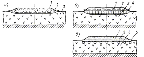где γн - удельный вес насыпного грунта; hн - глубина заложения прослойки от верха насыпи; φ - угол внутреннего трения насыпного грунта. Если прослойка уложена на контакте двух видов грунта, то в расчет принимают полусумму их углов внутреннего трения; g - ускорение свободного падения. При устройстве армирующих прослоек должны быть обеспечены сплошность и равнопрочность полотна на ширине дороги в пределах защемленной полосы, т.е. не должно быть ослабляющих прослойку стыков полотен. 5.49. При необходимости сооружения насыпей, в которых верхняя часть отсыпана из песка, а нижняя - из торфа (см. рис. 21, б) или местного переувлажненного суглинка, при устройстве подстилающих или морозозащитных слоев на переувлажненном глинистом грунте, т.е. в случаях, когда зернистый материал должен быть уложен на грунт с низкой несущей способностью, на границе зернистого слоя с подстилающим грунтом целесообразно устраивать прослойку из геотекстиля. Прослойка исключает вдавливание зернистого материала в слабый грунт, их взаимное перемешивание и потери песка в процессе отсыпки и уплотнения слоя. Толщина зернистого слоя при укладке геотекстиля может быть уменьшена на 20 - 25 % при условии, что такое уменьшение допустимо по остальным условиям работы дорожной конструкции (устойчивость к пучению, динамическим воздействиям, снегозаносимости). Наличие прослойки в основании зернистого слоя положительно сказывается на возможности уплотнения зернистого материала на слабом грунте. При обеспечении режима укатки с увеличением массы катков по мере уплотнения от легких до средних, коэффициент уплотнения зернистого материала может быть доведен до 0,92 - 0,95. Категорически запрещается применять тяжелые катки, что может привести к выпору грунта и разрыву геотекстиля. Подбор массы катка и режима укатки следует вести методом пробной укатки. 5.50. Геотекстиль целесообразно использовать при устройстве временных автомобильных дорог, подъездов, площадок, построечных дорог с низшими типами покрытий, а также постоянных дорог с пиком интенсивности в период строительства или в начале эксплуатации, проектируемых как временные дороги. В конструкциях временных дорог на слабых грунтах геотекстиль служит в качестве прослойки, укладываемой на границе между насыпным дренирующим (песком, щебнем, песчано-гравийной смесью) и подстилающим грунтом. Применение геотекстиля способствует улучшению условий движения транспортных средств вследствие снижения колееобразования при заданной толщине насыпного слоя, приводит к снижению толщины слоя зернистых материалов, отказу от применения в основании насыпи хворостяной выстилки, лежневого настила или от укладки сборных покрытий из инвентарных деревянных щитов. Прослойки из геотекстиля рекомендуется устраивать при строительстве временных дорог на основаниях, сложенных слабыми минеральными, органо-минеральными и органическими грунтами (торфами). Конструкции насыпей с прослойками из геотекстиля предусматривают их укладку в основание или тело насыпи, а также под насыпь, поверх лежневого настила. Соответственно различают три типа конструкции насыпей (рис. 24). Тип насыпи назначается в зависимости от строительного типа основания и физико-механических свойств слабого и насыпного грунтов. Минимальную толщину насыпного слоя hп в конструк