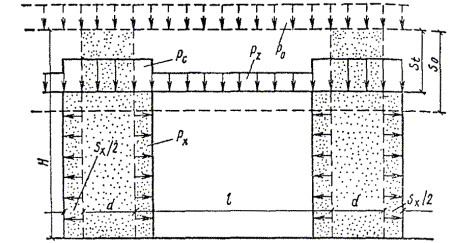 где cω - сцепление слабого грунта при расчетной плотности - влажности; φω - угол внутреннего трения слабого грунта при расчетной плотности - влажности; pz - вертикальные напряжения в грунте межсвайного пространства; рx - горизонтальные напряжения от бокового обжатия слабого грунта сваями в ходе осадки основания; р′ - предварительное обжатие слабого грунта, возникающее при внедрении свай. Рис. 25. Схема для расчета оснований с песчаными сваями H - мощность слабой толщи; l - расстояние между песчаными сваями в свету; d - диаметр песчаной сваи; S0 - осадка основания без сваи; St - осадка основания со сваями; Sx/2 - боковая деформация свай; pz - нагрузка на межсвайное пространство; p0 - нагрузка от веса насыпи; pc - нагрузка на сваи Величину p′ определяют по компрессионной кривой как напряжение, необходимое для уменьшения коэффициента пористости грунта в природном залегании ε0 до величины ε1, отвечающей пористости грунта, уплотненного в результате внедрения свай, и определяемой из выражения