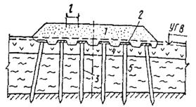 где Hi - мощность отдельного слоя с модулем деформации Ei. Целесообразность сооружения насыпи I типа толщиной больше hn следует обосновывать технико-экономическим расчетом. В конструкциях насыпей I типа (прежде всего на однопутных дорогах) при использовании прослойки из геотекстиля с условным модулем деформации св. 100 Н/см и относительной деформацией при разрыве до 50 % рекомендуется предусматривать боковую анкеровку прослойки и присоединять материал к жестким продольным упорам. В качестве жесткого упора можно использовать круглый лес или специальные элементы. В насыпях с жесткими упорами необходима равнопрочность конструкции в поперечном направлении, в том числе в стыках полотен и соединении прослоек с упором. Частично работу жестких упоров можно компенсировать повторным заведением концов полотна в тело насыпи по типу разомкнутой обоймы при условии плотного контакта заведенных концов с грунтом. При устройстве насыпей I типа геотекстиль укладывают непосредственно на слабый грунт, соединяя полотна путем сшивки, сварки, склейки или укладывая их внахлестку. В последнем случае величина нахлеста принимается по формуле (68), но не менее 20 см для насыпей на основании из минеральных или органоминеральных (заторфованных) грунтов и 30 - 40 см для насыпей на торфяном основании. При наличии поверхностных вод или плохом состоянии естественной поверхности земли (пни, колеи, лужи) необходимо отсыпать выравнивающий рабочий слой из местного грунта толщиной 20 - 30 см, но не менее глубины подтопления, по которому затем укладывают геотекстиль (см. рис. 24, тип I). Толщину насыпного слоя поверх прослойки из геотекстиля в этом случае можно снизить по сравнению с приведенной в табл. 22 на 30 % толщины рабочего слоя при глубине подтопления до 20 см. На болотах преимущественно II типа, а также на участках глубоких болот I типа, сложенных торфами малой или средней влажности, когда не обеспечено условие (см. формулу 72), устраивают насыпи II типа, которые позволяют уменьшить расход песчаных грунтов, приблизить прослойку из геотекстиля к поверхности проезжей части и ввести тем самым ее в зону действия напряжений от колеса автомобиля. Нижнюю часть насыпи отсыпают из местного торфяного грунта с обязательным его уплотнением (промятием). В насыпях II типа геотекстиль помещают на границе между нижней торфяной и верхней минеральной частями насыпи. Полотна геотекстиля укладывают внахлестку, с величиной перекрытия не менее 0,2 м. 5.52. На болотах II - III типа, заполненных сильносжимаемым слаборазложившимся торфом, и на болотах сплавинного типа устраивают насыпи III типа. Распределение напряжений от временной нагрузки достигается устройством основания из лежневого настила или фашинной (хворостяной) выстилки с засыпкой песчаным грунтом толщиной 0,6 - 0,7 м. Для повышения эксплуатационной надежности конструкции поверх лежневого настила или выстилки укладывают прослойку из геотекстиля, исключающую утечку песка сквозь щели в настиле. Временное понижение грунтовых вод 5.53. В индивидуальных случаях существенного ускорения осадки на ответственных объектах можно добиться путем временного понижения уровня грунтовых вод. Наибольший эффект этот метод дает в комплексе с временной пригрузкой. Снижение уровня грунтовых вод в слабой толще обеспечивает временное увеличение нагрузки н