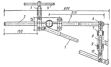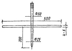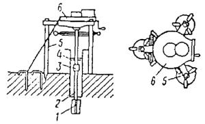 По результатам испытаний строят график изменения по глубине усилия зондирования, удельного сопротивления зондированию (рис. 2). Рис. 2. Пример обработки результатов статического зондирования болотных грунтов а - график; б - эпюра (цифры - слои и прослойки); в - геологический разрез; 1 - древесно-осоковый торф; 2 - тростниковый торф; 3 - сапропель; 4 - мергель; 5 - мелкий песок. Испытание грунтов на сдвиг в условиях природного залегания приборами лопастного типа Испытание заключается в измерении максимального крутящего момента, возникающего при срезе грунта во время вращения в нем крестообразной лопасти. Для массовых испытаний при зондировании торфяных залежей, пластов сапропелей и илов рекомендуется использовать прибор сдвигомер-крыльчатку конструкции Калининского политехнического института СК-8 или сдвигомер-крыльчатку БЕЛДОРНИИ. Методика испытаний грунтов сдвигомером-крыльчаткой СК-8 (рис. 3) заключается в следующем. Измерительная головка надевается на переходник, в отверстие переходника и упора завинчивается стопорный винт. Затем при помощи рукояток крыльчатка задавливается в грунт до полной ее высоты. Перед поворотом проверяется положение стрелки индикатора и циферблат устанавливается на нуль. После указанных операций и проверки вертикального положения штанги обеими руками осуществляется поворот измерительной головки по часовой стрелке. По мере роста угла поворота отклонение стрелки индикатора возрастает. В процессе поворота следят за стрелкой индикатора до тех пор, пока не прекратится ее отклонение и не начнется спад. Положение стрелки, соответствующее началу ее обратного движения, представляет собой искомое значение. Эта величина записывается в журнал. Обычно разрушение грунта происходит при углах поворота от 20 до 60°. Рис. 3. Конструкция сдвигомера СК-8 1 - крыльчатка; 2 - устройство для учета трения штанг; 3 - 4 - штанги, соединенные резьбовыми переходниками; 5 - измерительная головка с рукояткой; 6 - индикатор часового типа Влияние трения по штангам учитывается следующим образом. После задавливания крыльчатки до заданной глубины прибор слегка поднимают (на 10 - 15 мм) при помощи ручек. При этом лопасти отключаются от штанг. Далее осуществляется поворот штанг с фиксацией по индикатору усилия, идущего на преодоление трения штанг о грунт. После этого штанги опускаются и приводятся в зацепление с крыльчаткой. Далее осуществляется поворот с включенной крыльчаткой. По окончании испытания прибор извлекается из грунта. Для отвинчивания штанг можно пользоваться стопорным винтом. При задавливании и извлечении прибора необходимо следить за тем, чтобы движение штанг осуществлялось по вертикали. Если при задавливании и повороте крыльчатки встречаются пни или камни, то необходимо извлечь прибор из грунта и попытаться задавить прибор в другом месте. Крыльчатки имеют следующие размеры: H = 100, D1 = 54 и D2 = 75 мм. Сдвигомер-крыльчатка БЕЛДОРНИИ (рис. 4) состоит из трех основных узлов: рабочего наконечника (крыльчатки), комплекта штанг и динамометрического устройства. Рис. 4. Лопастной прибор БЕЛДОРНИИ для определения сопротивления сдвигу торфяных грунтов 1 - рукоятка; 2 - верхняя штанга; 3 - полумуфта; 4 - нижняя штанга; 5 - лопасть Прибор комплектуется двумя крыльчатками одинаковой высоты (100 мм), но с различными диаметрами - 54 и 75 мм. Четырехлопаст