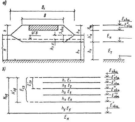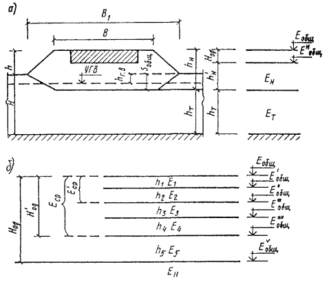 где H′од - толщина слоев дорожной одежды, расположенных выше песчаного слоя (см. рис. 3); Eн - модуль упругости грунта насыпи; Eср - средний модуль упругости дорожной одежды;