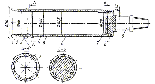 Рис. 2. Грунтонос конструкции Игумнова для взятия монолитов илов и других глинистых грунтов мягкопластичной и скрытотекучей консистенции 1 - башмак; 2 - направляющая; 3 - резцы; 4 - нижний стакан; 5 - гильза; 6 - верхний стакан; 7 - диафрагма; 8 - головка с конусным переходом