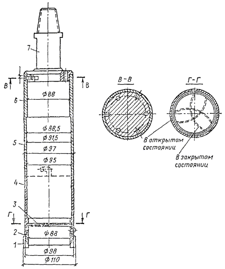 Рис. 3. Грунтонос конструкции Фурса для взятия монолитов илов и других глинистых грунтов мягкопластичной и скрытотекучей консистенции 1 - тормозная лопасть; 2 - башмак; 3 - лепесток; 4 - нижний стакан; 5 - гильза; 6 - верхний стакан; 7 - головка