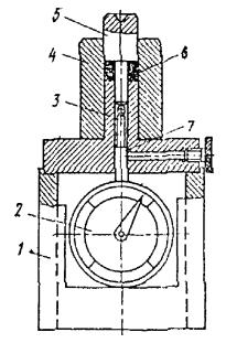 q1 - масса пикнометра с грунтом и водой, г; q2 - масса пикнометра с водой, г; ω - влажность воздушно-сухого грунта, %; q - масса воздушно-сухого грунта, г. За расчетную плотность частиц грунта принимают среднее арифметическое из результатов двух параллельных определений; расхождение допускается не более 0,02 г/см3. Метод высоких давлений. Плотность твердой фазы органических грунтов можно определить с помощью уплотнителя УВД-3 конструкции Калининского политехнического института (рис. 7). Торф в воздушно-сухом состоянии (влажность 10 - 25 %) подвергают сжатию в закрытой камере под давлением 350 - 400 МПа (3500 - 4000 кгс/см2). В сжатом состоянии определяют его объем с последующим пересчетом и вычислением плотности минеральной части. Порядок определения следующий. Втулки (см. рис. 7) с верхним штоком снимают с нижнего штока и переворачивают при вставленном штоке. В свободное пространство втулки засыпают навеску исследуемого грунта, затем во втулку вставляют нижний шток с индикатором. Рис. 7. Конструкция уплотнителя УВД-3 1 - подставка; 2 - индикатор; 3 - нижний шток; 4 - втулка; 5 - верхний шток; 6 - испытываемый грунт; 7 - зажимный болт Собранный прибор устанавливают на подставку и затем на нижнюю плиту пресса. Далее образец нагружают до 10 кН и выдерживают под этой нагрузкой в течение 2 - 3 мин. При этом деформация образца, регистрируемая индикатором, должна прекратиться. Затем записывают максимальное показание индикатора, по которому вычисляют толщину образца при заданной нагрузке. Далее нагрузку снимают, вынимают втулку вместе с верхним штоком, и взвешивают шток. Контролируют массу остающегося на штоке уплотненного образца кольцевой формы. Плотность минеральной части при данной влажности вычисляют по формуле