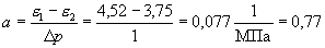 где a - коэффициент уплотнения, определяемый по компрессионной кривой; εср - средний коэффициент пористости, равный (ε1 + ε2)/2; ε1 - коэффициент пористости грунта, соответствующий нагрузке p1; ε2 - соответствующий нагрузке p2. По компрессионной кривой (см. рис. 1) находим a и εср в интервале нагрузок p1 = 0,1 МПа (1 кгс/см2) и p2 = 0,2 МПа (2 кгс/см2), ε1 = 4,52; ε2 = 3,75; εср = 4,135.