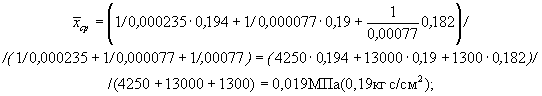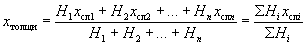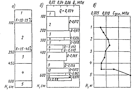где pi = 1 / σ2i - веса измерений; x - средневзвешенное значение показателя для однородного слоя; xi - среднеарифметические значения показателя отдельных выработок. Средневзвешенное значение дисперсии однородного слоя определяют по формуле σ2ср = (n1σ21 + n2σ22 + n3σ23) / (n1 + n2 + n3), (14) где n1, n2, n3 - количество измерений показателя для отдельных скважин в пределах рассматриваемого слоя; σ1, σ2, σ3 - дисперсии соответствующих показателей. В рассматриваемом примере средневзвешенное значение сопротивляемости сдвигу слоя в пределах поперечника равно: x = (4250 · 0,194 + 1300 · 0,19 + 1300 · 0,182) / (4250 + 13000 + 1300) = 0,019 МПа (0,19 кгс/см2); x1 = 0,194; x2 = 0,19; x3 = 0,0182 МПа (0,182 кгс/см2); p1 = 1 / σ21 = 4250; р2 = 1 / σ22 = 13000; p3 = 1 / σ23 = 1300; σcp = 0,0018 МПа (0,018 кгс/см2). Kв = 0,018 / 0,19 · 100 = 9,5 %. Средневзвешенное значение показателей болотных грунтов, найденное по формуле (14), можно использовать как оценку истинного значения показателя механических свойств грунтов, характеризующих прочность (сопротивляемость сдвигу), деформативность (сжимаемость) и скорость уплотнения грунта во времени. Для слоистой толщи в целом Толща болотных грунтов, как правило, не бывает однородной, а состоит из нескольких слоев. Каждый слой грунта характеризуется своими физико-механическими показателями. В некоторых случаях возникает необходимость осреднять значения того или иного параметра для толщи в целом. Опыт показывает, что с достаточной для практических целей точностью слоистую толщу можно характеризовать общим средневзвешенным значением показателя, приписывая каждому значению xсл в качестве веса его толщину Hi
