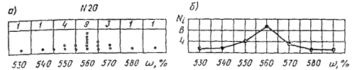 Доверительный интервал значений сопротивляемости сдвигу равен 0,019 - 0,0077 МПа (0,19 - 0,007 кгс/см2) или 0,0183 - 0,0197 МПа (0,183 - 0,197 кгс/см2). В качестве расчетного значения следует принять наименьшее значение, т.е. cрасч = 0,0183 МПа, (0,183 кгс/см2). Пример 2. Требуется определить расчетную влажность слабого грунта, используемого в качестве основания дорог III категории. Все расчеты характеристик статистического распределения приведены на рис. 3. Рис. 3. График для определения расчетной влажности болотных грунтов вероятностно-статистическим методом а - график рассеяния; б - полигон распределения Вычисление характеристики статического распределения: