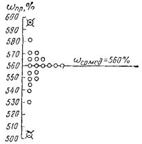 Доверительный интервал значений влажности равен 556 - 564 %. В качестве расчетного значения следует принять менее выгодное, т.е. ωрасч = 564 %. Принимая соответственно коэффициент надежности α = 0,9 и α = 0,95, получим следующие значения расчетной влажности: