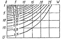 Параметр F(n) рассчитывается по формуле F(n) = [n2 / (n2 - 1)] ln(n) - (3n2 - l) / 4n2. (9) В случае, если Qг окажется меньше требуемой, расчет повторяется с самого начала, при этом шаг дрен уменьшается и варьируется до получения требуемой степени консолидации основания. Технология сооружения текстильных дрен соответствует технологии сооружения песчаных дрен. Установку дрен осуществляют с помощью установок, оборудованных механизмом для погружения обсадной трубы и катушками для дрен. В качестве базовой машины могут быть использованы сваебойный агрегат, экскаватор или кран. После установки дрен необходимо установить наблюдательные марки, по которым должен проводиться контроль для определения сроков снятия пригрузки и устройства покрытия. Все работы по устройству дрен и установке наблюдательных марок необходимо оформлять актом на скрытые работы. ПРИЛОЖЕНИЕ 14ПРИМЕР РАСЧЕТА НАСЫПИ С ПЕСЧАНЫМИ СВАЯМИИсходные данные. Автомобильная дорога IV категории с асфальтобетонным покрытием. Насыпь: рабочая отметка 3; ширина поверху 12 м; заложение откосов 2:3; плотность грунта насыпи ρн = 2 т/м3. Основание насыпи: иольдиевые глины III разновидности скрытотекучей консистенции; мощность H = 7 м. Прочностные характеристики глин в условиях природного залегания: полное сцепление cω = 0,015 МПа (0,15 кгс/см2); угол внутреннего трения φω = 0°, структурное сцепление cc = 0,01 МПа (0,1 кгс/см2). Предел структурной прочности при компрессионном сжатии pстр = 0,04 МПа (0,4 кгс/см2). Относительная осадка под нагрузкой 0,06 МПа (0,6 кгс/см2) составляет λ0 = 0,1. Коэффициент поперечной деформации μг = 0,45. Устойчивость необходимо проверить исходя из двух условий: pрасч < pбез - исключение деформации сдвига; pрасч < pстр - исключение осадки. Расчетная нагрузка на основание pрасч = γнh = 9,8 · 2 · 3 = 0,06 МПа (0,6 кгс/см2). Безопасная нагрузка при φ = 0. pбез = cc / β = 0,04 / 0,31 = 0,032 МПа (0,32 кгс/см2), т.е. pрасч > pбез и устойчивость по первому условию не обеспечена. Поскольку, pрасч > pстр, то устойчивость основания по второму условию также не обеспечена. Для обеспечения устойчивости основания предлагается устроить песчаные сваи диаметром d = 0,3 м. Коэффициент бокового давления песка ξ = 0,3. Условие обеспечения устойчивости при φ = 0 имеет вид pz - px = 2 · cс = 2 · 0,01 = 0,02 МПа (0,2 кгс/см2). В долях от расчетной нагрузки допустимая разность главных напряжений составит (pz - px) / p0 = 0,02 / 0,06 = 0,3. По таблицам при λ0 = 0,1 этой величине отвечает сближение m = d / l = 0,2. Для обеспечения второго условия давление на слабый слой должно быть ограничено 0,04 МПа (0,4 кгс/см2). В долях от p0 это составит 0,04 / 0,06 = 0,66. По таблице* этой величине соответствует сближение 0,2. * Методические рекомендации по проектированию и технологии сооружения вертикальных песчаных дрен и песчаных свай при возведении земляного полотна на слабых грунтах / СОЮЗДОРНИИ, - М., 1974. - 57 с. Из расчета по обоим условиям принимаем m = 0,2 и шаг свай l + d =1,8 м. ПРИЛОЖЕНИЕ 15РАСЧЕТ КОНСТРУКЦИИ НАСЫПИ С ИСПОЛЬЗОВАНИЕМ НОМОГРАММПрогноз конечной величины осадки Величину погружения насыпи в болотную залежь (осадку насыпи) определяют по формуле Sобщ = Sсж + Sот, (1) где Sобщ - общая осадка насыпи; Sсж - осадка сжимающихся (уплотняющихся) слоев болотной залежи; Sот - осадка отдавливаемых слоев болотной залежи, происходящая за счет выдавливания (выпора) слабых грунтов (3б типа) при любой скорости отсыпки, частичного выдавливания грунтов (3а типа) пр