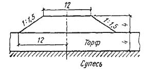5.3. Целью различных конструктивных решений и технологических мероприятий может быть: повышение устойчивости основания насыпи (группа А); ускорение достижения допустимой интенсивности осадки (группа Б); исключение недопустимых упругих колебаний (группа В). Некоторые мероприятия имеют комплексный характер и могут выполнять одновременно несколько назначений. 5.4. При предварительном отборе вариантов в первую очередь рассматривают соблюдение требования устойчивости основания. Для типа I оснований (по устойчивости) могут применяться решения групп Б и В. Для оснований II типа применяют решения групп А (возможно только технологические), Б и В. Для оснований III типа применяют решения групп А, Б и В. Примечание. При использовании метода временной пригрузки тип основания по устойчивости следует уточнять с учетом увеличения высоты насыпи на толщину пригрузочного слоя. 5.5. По результатам прогноза протекания осадки во времени определяют целесообразность применения мероприятий группы Б, которые становятся необходимыми при невыполнении условия п. 1.8. 5.6. По данным проверки прочности дорожной конструкции на динамическое воздействие транспортных средств в случаях, если толщина насыпи меньше величин, установленных табл. 1, назначают конструктивные мероприятия группы В. Конструктивно-технологические решения, предусматривающие использование в основании слабых грунтов5.7. Независимо от наличия и вида мероприятий, направленных на повышение устойчивости, стабильности и прочности, при определении толщины насыпи, возведенной на слабом грунте, следует учитывать погружение ее подошвы, т.е. осадку. Схема конструкции земляного полотна, возведенного на поверхности слабой толщи, показана на рис. 11. Рис. 11. Типовая схема земляного полотна, возведенного на поверхности слабой толщи 5.8. При определении требуемого объема грунта для возведения насыпи сечение погруженной части Fпогр принимают в виде трапеции с высотой, равной расчетной величине осадки, и меньшим основанием, равным ширине земляного полотна поверху (см. рис, 11), т.е. Fпогр = SB + S(h - S)m. Ориентировочно объем земляных работ может быть определен в соответствии с прил. 8. 5.9. Если дополнительными мероприятиями не предусмотрено каких-либо изменений, крутизну откосов насыпи и боковые водоотводные канавы принимают по общим правилам проектирования земляного полотна в обычных условиях. 5.10. Для насыпей, сооружаемых на слабых грунтах, следует, как правило, применять дренирующие грунты. Недренирующие грунты допускается использовать для дорог с облегченными, переходными и низшими типами покрытий при условии обеспечения устойчивости и прочности конструкции. Для дорог с переходными и низшими типами покрытий, а также сборными покрытиями при стадийном строительстве на переходах через торфяные болота допускается использовать в нижней части насыпи торф с показателем волокнистости не менее 50 % и влажностью не более 800 %. Верхнюю часть насыпи при этом устраивают из минерального грунта (рис. 12). Толщина верхнего слоя от границы торфяной части до низа одежды для различных грунтов насыпи устанавливается расчетом и должна составлять не менее, м: песок, супесь легкая пылеватая................................................................ 0,7 песок пылеватый, супесь легкая............................................................... 1,2 супесь пылеватая и тяжелая пылев