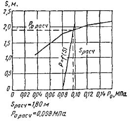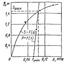 Время завершения фильтрационной осадки слоя торфа мощностью 4 м при односторонней фильтрации составит Tстаб = 1,13 · 4002 / 14,16 = 1,13 · 160000 / 14,16 = 1360,4 ч = 1,45 г. Расчет конструкции насыпи на слабом основании по уточненной методике 1. Расчет конечной величины осадки По компрессионным и консолидационным зависимостям определяем расчетное значение модуля осадки eрасчр с учетом срока службы дорожной конструкции по формуле eрасчp = eI + 1000mplg(tрасч / tI), (7) где eI - модуль первичной осадки; mp - консолидационный параметр; tI - время завершения первичной осадки; tрасч - расчетное время, определенное по формуле tpacч = Tсл(hф / Hф)2, (8) где hф и Hф - путь фильтрации воды соответственно из образца и из слоя. В данном случае tрасч = 20 · 525200 · (2 / 400)2 = 262 мин. Задаваясь несколькими величинами нагрузок, рассчитаем eрасчр. При p = 0,05 МПа (0,5 кгс/см2) eрасчр =290 + 1000 · 0,04lg(262) / 50 = 318 мм/м; p = 0,10 МПа (1,0 кгс/см2); eрасчp = 390 + 1000 × 0,056lg(262/50) = 430 мм/м; p = 0,15 МПа (1,5 кгс/см2) eрасчp = 440 + 1000 · 0,05lg(262 / 50) = 476 мм/м. Полученные значения наносят на сетку «e - p» и получают зависимость расчетного модуля осадки от нагрузки, т.е. расчетную компрессионную кривую (кривая 3, рис. 8, прил. 3). Величину осадки определяем по формуле (32) основного текста. S = 0,001ΣepziHi. При имеющемся соотношении ширины подошвы насыпи понизу к мощности слабого слоя можно принять, что слой однороден по глубине по напряженному состоянию, т.е. расчет следует вести в соответствии с указанным выше пунктом по формуле S = 0,001epzH. Для расчета осадки насыпи применяем также графоаналитический метод, согласно которому необходимо определить расчетную нагрузку в зависимости от осадки насыпи p = f(S) и зависимость осадки от нагрузки S = f(p). Расчетную нагрузку определяем по формуле (см. п. 3.8): p = γнh + γвзвнS, где γн - удельный вес грунта насыпи; γвзвн - то же, с учетом взвешивания; h - высота насыпи; S - осадка. При S = 0 p = 2 · 4 = 8 т/м2 = 0,08 МПа (0,8 кгс/см2). При S = 1 и p = (2 · 4) + (2 - 1) · 19,8 = 0,09 МПа (0,9 кгс/см2). Далее определяем осадку слабого основания под различной нагрузкой от веса насыпи с использованием расчетного модуля осадки торфа. При p = 0,05 МПа (0,5 кгс/см2) eрасчp = 318 мм/м, S = 0,001 · 318 · 4 = 1,27 м; p = 0,1 МПа (1 кгс/см2); eрасчp = 430 мм/м, S = 0,001 · 430 · 4 = 1,72 м; p = 0,15 МПа (1,5 кгс/см2); eрасчp = 476 мм/м, S = 0,001 · 476 · 4 = 1,9 м. Рис. 3. Расчет осадки графоаналитическим методом Результаты наносят на сетку координат «S - p» (рис. 3), получая кривую S = f(p) и прямую p = f(S). Точка пересечения указанных зависимостей определит расчетные осадку и нагрузку: Sрасч = 1,68 м и pрасч = 0,097 МПа (0,97 кгс/см2). 2. Расчет устойчивости основания Расчет устойчивости основания может быть выполнен по аналогии с вышеизложенным. Однако при оценке устойчивости основания при медленной отсыпке в качестве расчетных показателей прочностных свойств грунтов могут быть приняты величины «кажущиеся» сцепления и угла внутреннего трения грунта, полученные в опыте с полной консолидацией, соответствующие состоянию грунта при полном уплотнении под расчетной нагрузкой. В данном примере c′ = 0,011 МПа (0,11 кгс/см2), φ′ = 30°. По графикам рис. 6, 7 основного текста находим при V = 0,33 коэффициент β = 0,108, отсюда pконбез = 0,011 / 0,108 = 0,102 МПа (1,02 кгс/см2). Определяем kбез = pконбез / pрасч = 0,102 / 0,097 = 1,05. Таким образом, расчет устойчивости показал, что в данном случае торфяной слой может быть использован в качестве основания принятой конструкции при условии медленной отсыпки насыпи. 3. Прогноз осадки во времени Прогн