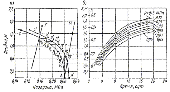 где c′ и φ′ - кажущиеся сцепление и угол внутреннего трения, получаемые в опыте с полной консолидацией образцов (консолидированные испытания с дренажем); β - та же функция, что и при расчете на быструю отсыпку (см. рис. 7), но принимаемая в зависимости от значения φ′. 3.18. Для приближенных расчетов допускается при определении pконбез использовать те же формулы, что и для pначбез, с подстановкой в них вместо значения φначcнач и cпрнач величин φкон, cкон и cпркон, соответствующих конечной плотности - влажности грунта, ωкон на данном горизонте, которую он будет иметь после завершения процесса уплотнения под расчетной нагрузкой (влияние подвижной нагрузки в данном случае не учитывается). 3.19. При необходимости определения безопасной нагрузки на любой заданный момент процесса уплотнения толщи следует вести расчет по точкам, используя формулу