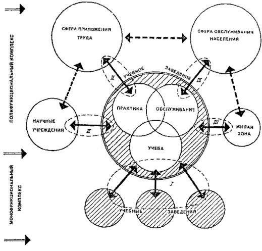 Обозначения: "+" - зона и подзона обязательны; "0" - зона и подзона возможны. Требования к проектированию отдельных зон3.8. Площади территорий учебных комплексов определяются заданием на проектирование с учетом места расположения комплекса, состава учебных заведений и существующих нормативов по каждому типу учебного заведения. При этом размеры участков должны устанавливаться не по сумме площадей участков учебных заведений, входящих в комплекс, а исходя из общей численности учащихся в максимальную смену, т.е. расчетного контингента. Следует максимально интенсивно использовать при кооперировании однородные зоны, уменьшая суммарные размеры территории по сравнению с нормативными, за счет учета возможного несовпадения времени занятий и возможности соседних незагруженных зон. Функциональные зоны3.9. При укрупненных расчетах величину требуемого участка учебной зоны можно определять по норме площади на одного учащегося расчетного контингента, равной 20-25 м. На территории учебной зоны следует размещать учебные и административные здания, мастерские, клубные и актовые залы, столовую. При контингенте учебного комплекса более 4000 учащихся, как правило, на генеральном плане в составе учебной зоны следует выделять: подзону учебно-производственных или научно-производственных подразделений (в зависимости от вида учебного заведения); подзону общественного назначения. На участке подзоны общественного назначения следует размещать корпуса или подразделения административно-управленческого обслуживания, информационные службы, научно-технический центр, актовый и клубные залы и т.д. При проектировании генерального плана комплекса учебных заведении одного уровня обучения, но различных отраслей народного хозяйства, учебную зону при любой численности учащихся в комплексе следует, как правило, дублировать для каждого учебного заведения. 3.10. Учебно-практическая подзона комплекса может выделяться на отдельный участок: в учебных центрах промпредприятий I-II категорий по санитарным нормам, в учебных комплексах агропромышленных объединений и ряде других. Учебная зона учебных комплексов здравоохранения подразделяется на две подзоны - учебно-теоретическую и учебно-практическую, основу которой составляют клинико-поликлиническая подзона, размещаемая на территории учебного комплекса, а также городская клиническая зона, размещаемая в зависимости от планировочной структуры в различных частях города. Научные подразделения крупных монофункциональных учебных комплексов, формирующие научную подзону, являются функционально едиными для теоретических и практических циклов обучения, и поэтому их следует размещать, как правило, между теоретической и практической подзонами учебной зоны. 3.11. Совместное размещение жилой и учебной зон в едином комплексе является наиболее рациональным, так как обеспечивает тесную взаимосвязь основных зон комплекса, исключает ежедневные нагрузки на транспорт, экономит городскую территорию и средства, позволяет избежать дублирования технических сооружений и предприятий культурно-бытового назначения. 3.12. Общую площадь жилой зоны, которая состоит из зданий общежитий и территории для отдыха комплекса, следует определять: суммированием площадей жилых зон - для учебных заведений разного уровня образования; по об