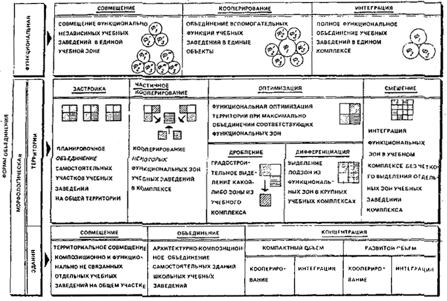 Центральный научно-исследовательский и проектный институт типового и экспериментального проектирования школ, дошкольных учреждений, средних и высших учебных заведений (ЦНИИЭП учебных зданий) Госкомархитектуры Справочное пособие к СНиП Серия основана в 1989 году Проектирование учебных комплексов и центров Москва Стройиздат 1991 СОДЕРЖАНИЕ Организационные предпосылки создания учебных комплексов. 7 2. ТРЕБОВАНИЯ К РАЗМЕЩЕНИЮ УЧЕБНЫХ КОМПЛЕКСОВ.. 9 3. ТРЕБОВАНИЯ К УЧАСТКАМ УЧЕБНЫХ КОМПЛЕКСОВ.. 15 Требования к проектированию отдельных зон. 21 4. ФУНКЦИОНАЛЬНО-ПЛАНИРОВОЧНЫЕ РЕШЕНИЯ.. 25 5. АРХИТЕКТУРНО-КОМПОЗИЦИОННЫЕ РЕШЕНИЯ.. 31 Приложение 1. ТЕРМИНОЛОГИЯ.. 40 Приложение 2 Примерный состав кооперированных комплексов учебных и общественных зданий. 42 ПРЕДИСЛОВИЕНастоящее справочное пособие разработано к СНиП 2.08.02-89 "Общественные здания и сооружения" на основе анализа и обобщения современного передового опыта формирования учебной сети и проектирования зданий профессиональных учебных заведений всех уровней образования - от учебно-курсовых комбинатов до институтов повышения квалификации. Единство системы и преемственность всех звеньев образования - основной принцип, на котором базируется создание учебных комплексов. Единая система обучения является функционально-педагогической основой создания комплекса учебных заведений. Широкое внедрение учебных комплексов и центров в дополнение к существующей системе разрозненных сетей учебных заведений направлено на преодоление разобщенности учебных заведений разного уровня образования и разной отраслевой принадлежности; эффективное сочетание отраслевого и территориального планирования подготовки и повышения квалификации кадров в территориально-производственных комплексах и промышленных районах, агропромышленных объединениях, крупных фирмах, а также в отдельных регионах и городах. Создание комплексов, как показывает отечественная и зарубежная практика, способствует повышению качества и преемственности обучения, концентрации капитальных затрат на строительство и экономии средств при возведении и эксплуатации учебных зданий. Учебный комплекс рассматривается в настоящем пособии как специфический тип архитектурного объекта, формируемый путем функционально-архитектурного, территориального и организационного объединения нескольких учебных заведений одного или разных уровней образования с многообразными формами и степенью кооперации и являющийся крупным элементом объемно-пространственной композиции различных функциональных зон города. Предполагаемая в результате демократизации образования гибкость форм и методов обучения приведет к расширению организационных структур и, следовательно, к расширению традиционной номенклатуры классических типов учебных заведений. Однако, при этом сохранятся стабильность отдельных функциональных элементов учебных заведений, их универсализация и унификация между разными ступенями образования. Это позволяет рекомендовать при проектировании учебных комплексов и центров использовать следующие пособия к СНиП 2.08.02-89: "Проектирование профессионально-технических и средних специальных учебных заведений и учебных комбинатов", "Проектирование высших учебных заведений и институтов повышения квалификации" (разработаны ЦНИИЭП учеб