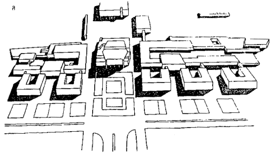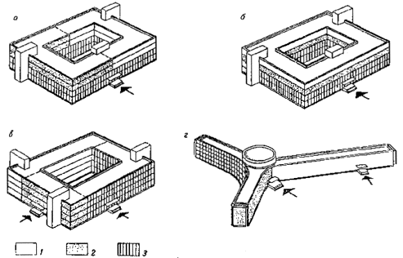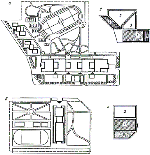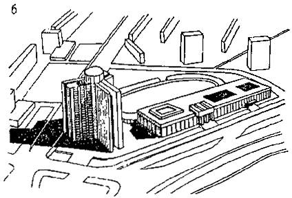 Рис. 18. Варианты композиционного решения учебного центра торгово-бытового обслуживания (архит. Н.К.Цуканова) а - территориальное объединение ПТУ и техникума; б - организационное объединение ПТУ и техникума; в - функциональное объединение ПТУ и учебного комбината; 1 - учебно-теоретические помещения; 2 - помещения спецдисциплин; 3 - учебно-производственные мастерские; 4 - помещения культурно-бытового обслуживания учащихся; 5 - помещения бытового обслуживания населения учащимися Рис. 19. Размещение учебных заведений в компактном здании учебного комплекса а - смешанное; б - поэтажное; в - секционное; г - лучевое; 1- вечерний техникум; 2 - школа рабочей молодежи; 3 - учебно-курсовой комбинат Кооперация учебного комплекса с учреждениями административной зоны предопределена как самой функциональной структурой учебного комплекса, имеющего группы помещений, аналогичных учреждениям обслуживания трудящихся, так и организационной структурой предприятия. 5.7. Прием самостоятельного расположения учебного комплекса следует применять в проектах предзаводских зон крупных предприятий, когда создаются специализированные комплексы, составляющие административный центр предприятия. Причем возможны два варианта взаиморасположения учебных зданий и пешеходных магистралей, которые условно можно назвать параллельным и перпендикулярным. В первом, наиболее распространенном, учебный комплекс располагается параллельно пешеходной магистрали. Перпендикулярное решение предполагает размещение учебного здания на пути основного потока трудящихся, что достигается включением проходной в это здание, в другом случае учебный корпус может фланкировать трассу. Это сокращает затраты времени на путь к учебному зданию. Рис. 20. Зависимость архитектурно-композиционного решения здания учебного комплекса от моста расположения а - учебный комплекс на предзаводской территории (учебный центр ВАЗа, Г. Тольятти; Гипропрос, архит. А.П.Голощапов, Г.П.Собельман); б - учебный комплекс в селитебной зоне (комплекс профтехучилищ (г.Ленинград). ЛенНИИпроект, проектное предложение, архит. Л.К.Фешина) 5.8. Учебные центры, размещаемые на предзаводских площадях или в предзаводских зонах, становятся формирующими элементами застройки. В этом случае их композиция требует достаточно крупного решения, которое может удержать большое пространство площади или протяженной магистрали. Здесь концентрация функциональных элементов учебных комплексов должна достичь наибольшей степени (рис.20,а). Одновременно в проектах следует учитывать необходимость постепенного перехода в архитектурном решении от индустриального масштаба к человеку, переключения масштабного восприятия архитектурного окружения. 5.9. В отличие от объектов, размещенных в промышленной зоне и решаемых крупными массами, при размещении учебного центра в селитебной зоне города его архитектура должна отражать особенности окружающей застройки и быть соразмерна с жилыми домами, учитывать особенности ландшафта, организацию транспортных и пешеходных связей и другие градостроительные факторы. Облик учебного комплекса, расположенного непосредственно в селитебной зоне, должен рассчитываться на восприятие с близкого расстояния, преимущественно зрителями-пешеходами, поэтому и решаться более локальными средствами - деталями здан