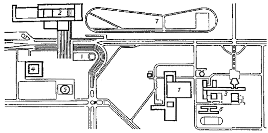 Рис. 11. Генплан административно-общественного центра предприятия с учебным центром, г. Днепропетровск; ЦПИИЭП учебных зданий, проектное предложение, авторы А.В. Анисимов, А.М. Гарнец, С.Ф. Наумов а - генплан; б - схема зонирования территории; 1 - учебная зона; 2 - спортивная зона; 3 - озеленение; 4 - культурно-бытовая зона 3.15. Физкультурно-спортивные сооружения учебных заведений, входящих в состав комплекса, следует объединять в единую спортивную зону и размещать в наиболее благоприятной части территории, примыкающей к озелененным участкам, или связанной с озелененными пешеходными коммуникациями (рис.10). Количество сооружений спортивной зоны определяется их пропускной способностью на расчетное число учащихся, занимающихся спортом. Набор открытых спортивных площадок на группу учебных заведений в учебных комплексах определяется заданием на проектирование. 3.16. При значительных размерах территории учебного комплекса наряду с выделением функциональных зон и подзон проект комплекса следует решать как многоцентровую композиционную структуру с выделением входной зоны, учебных подзон, зоны общественного обслуживания, рекреационной зоны и т.д. 3.17. При проектировании генеральных планов предзаводских территорий участок учебного комплекса следует рассматривать как подзону административно-общественного центра (АОЦ) предприятия, в состав которой должны входить корпус административно-управленческого назначения, инженерный корпус, конференц-зал, научно-техническая библиотека и т.д. Учебная подзона в составе АОЦ вместе с другими зонами организуют главную предзаводскую площадь. В этом случае функциональные зоны учебного комплекса следует по возможности кооперировать с соответствующими функциональными зонами предзаводской территории (рис.11 и 12). Рис. 12. Предзаводская зона ВАЗ в г. Тольятти, Промстройпроект, Гипрозапрос 1 - учебный центр; 2 - административный центр; 3 - ПТУ; 4 - медицинский центр; 5 - музей; 6 - мастерские; 7 - автотрек 4. ФУНКЦИОНАЛЬНО-ПЛАНИРОВОЧНЫЕ РЕШЕНИЯ4.1. Состав помещений учебных комплексов и требования к их проектированию следует принимать в соответствии с перечнем учебных заведений, формирующих комплекс. В отраслевых учебных комплексах следует стремиться к объединению однородных по функции групп помещении (рис.13). Проектирование зданий учебных комплексов должно вестись с учетом интеграции видов и уровней обучения, а следовательно - путем кооперации идентичных групп учебных помещений, их универсализации по оборудованию и унификации по планировочным параметрам. Это должно предопределить мобильность и приспособляемость здания к видовым и количественным изменениям в процессе функционирования учебного заведения. Рис. 13.Функциональная классификация и степень взаимосвязи групп помещений учебных комплексов I - блокировка, объединение помещений; II - интеграция функций;