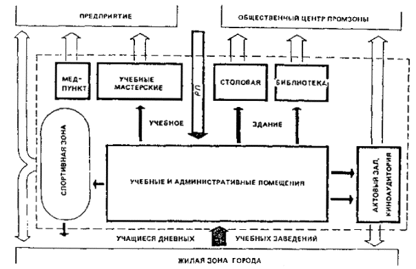 4.2. В отраслевых учебных комплексах, объединяющих учебные заведения разных ступеней образования, желательна кооперация помещений для теоретических занятий всех учебных заведений комплекса. Эти помещения следует группировать по кафедральному принципу, создавая блоки или группы помещений по предметам - предметные секции. Предметную секцию рекомендуют разделять на универсальную мобильную зону и специализированную статичную зону. Исходя из этого, предметная секция может состоять из: учебных помещений для лекционных и фронтальных форм занятий; учебных помещений, для семинарских и лабораторно-практических занятий (занятия групповые); учебно-практических (производственных) помещений, помещений для тренажеров, макетов и имитаторов производственной среды (занятия - бригадные и индивидуальные). 4.3. При размещении учебных заведений профессионального обучения рабочих в комплексе с другими учебными заведениями следует, как правило, предусматривать кооперированные учебные мастерские. Помещения учебных мастерских и полигоны учебных комплексов рекомендуется кооперировать с соответствующими помещениями и зонами производства (мастерскими, фермами, теплицами и др.). Если в состав учебного центра входят профтехучилище, учебно-производственные мастерские, следует рассчитывать по числу учащихся ПТУ на односменную работу. Во вторую смену будут заниматься учащиеся техникумов и учебного комбината. 4.4. В крупных учебных центрах, где организуется обучение трудящихся для группы предприятий, отрасли или экономического района, следует дополнительно иметь в составе подразделений расширенный методический кабинет с киностудией учебных фильмов и печатно-множительный цех. При создании в учебном комплексе АСУ необходимо предусмотреть диспетчерскую площадью 36 м2. 4.5. Подразделения культурно-воспитательного назначения (актовый, клубный, конференц-залы) и блок питания, входящие в состав зоны общественного назначения не имеют зависимости от профиля учебных заведений. Поэтому на группу учебных заведений или в составе учебного комплекса следует, как правило, предусматривать единые учреждения и предприятия культурно-бытового обслуживания, состав и вместимость которых определяется заданием на проектирование. В учебных центрах предприятии, размещаемых рядом с производством, возможна кооперация соответствующих групп помещений учебного центра и предприятия (рис.14). При определении величины, пропускной способности обслуживающих групп помещений - актового зала, столовой, библиотеки, здравпункта и т.п. следует предусматривать очередность их использования, а также сменность занятий (для учебных заведении курсовой сети, для заочных и вечерних учебных заведений) 4.6. Полная кооперация групп помещений общественно бытового обслуживания в учебных комплексах (учебно-спортивные и актовые залы, клубные помещения, стоповые, здравпункты) целесообразна при общем континенте до 3 тыс. учащихся (например, для комплекса профтехобразования). В крупных учебных комплексах на 5-6 тыс. учащихся совместно может использоваться лишь часть элементов учебно-вспомогательного назначения: плавательный бассейн, профилакторий, клуб и т.п. Хотя любое учебное заведение относится к "закрытым" учреждениям, т.е. предназначенным для специфического контингента, ориентирова
