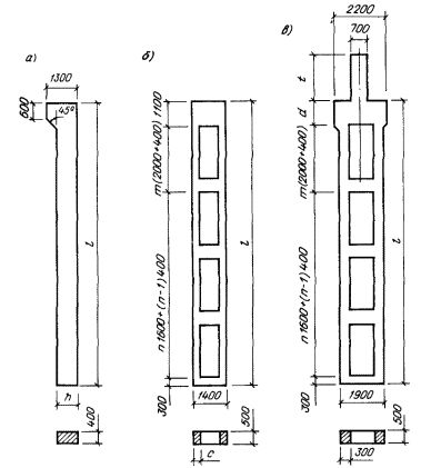 * В зависимости от высоты применяемой подкрановой балки. 5.9. Размеры элементов колонн рекомендуется принимать по рис. 4 и табл. 2, чтобы их можно было изготовлять в опалубке типовых колонн зданий. Размеры двухветвевой колонны должны быть такими, чтобы при нетрещиностойких ветвях усилие в менее нагруженной ветви от собственной массы, минимального давления одного крана и 90 % усилии его поперечного торможения не было растягивающим. 5.10. Колонны следует проектировать из тяжелого бетона, класс прочности при сжатии которого рекомендуется назначать: В15 - В25 - для обычно армированных колонн сплошного сечения; В25 - В30 - для двухветвевых колонн; В30 - В45 - для преднапряженных колонн сплошного сечения. Классы бетона по морозостойкости и водонепроницаемости должны назначаться как для сооружений класса II по степени ответственности и как для конструкций, подверженных попеременному замораживанию и оттаиванию в условиях эпизодического водонасыщения. 5.11. Колонны следует армировать стержневой арматурой, назначая рабочую продольную арматуру из стали класса: не напрягаемую - АIII; напрягаемую - АIV - АVI (включая термически упрочненную). Продольную арматуру располагают симметрично относительно оси сечения. 5.12. Колонны должны быть запроектированы с учетом использования стаканного стыка с фундаментом. Стальные колонны 5.13. Колонны следует проектировать симметричными сквозной конструкции с несущими вертикальными ветвями из широкополочных двутавров, раскрепленных раскосной решеткой. 5.14. В зависимости от высоты эстакады расстояние между ветвями колонн следует принимать по табл. 3. Высоту сечения траверсы для описания подкрановой балки следует назначать равной 600 - 800 мм. Рис. 4. Опалубочные размеры железобетонных колонн а, б - для крайнего ряда; в - для среднего ряда (размеры по табл. 2) Таблица 3