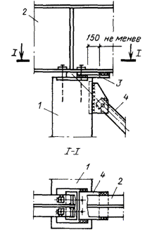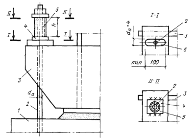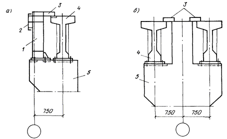 5.15. Крепление колонны к фундаменту следует проектировать на удлиненных анкерных болтах с учетом возможности подъема колонны в процессе эксплуатации эстакады не менее чем на 200 мм и горизонтального смещения в поперечном направлении не менее чем на 100 мм (рис. 5). Рис. 5. Деталь крепления к фундаменту стальной колонны, допускающего ее рихтовку: 1 - фундамент; 2 - анкерный болт; 3 - башмак колонны; 4 - прокладка; 5 - отрезок стальной трубы; 6 - овальное отверстие; h - по прогнозируемой осадке, но не менее 100 мм В ветвях колонны следует предусматривать отверстия для крепления инвентарной траверсы, используемой в случае необходимости поддомкрачивания. Вертикальные связи 5.16. Для обеспечения устойчивости сооружения и восприятия горизонтальных усилий в продольном направлении в пределах температурного блока необходимо предусматривать устройство по колоннам стальных вертикальных связей, располагаемых: при длине температурного блока до 84 м - одна связь посередине его длины; при длине температурного блока более 84 м - на расстоянии не более 48 м от торцов и не более 36 м по длине блока (в осях связей). 5.17. Вертикальные связи рекомендуется проектировать парными крестового типа (рис. 6) и устанавливать в двух плоскостях: при двухветвевых колоннах - по оси ветвей; при колоннах сплошного сечения - на расстоянии не более 100 мм от граней сечения. 5.18. Связи следует выполнять из одиночных уголковых профилей. Противостоящие связевые фермы следует соединять планками из уголкового профиля. 5.19. вертикальные связи должны быть рассчитаны на нагрузку Tl, приложенную в уровне опирания подкрановых балок и равную горизонтальной продольной нагрузке, деленной на число связей в пределах одного температурного блока. Эту нагрузку следует передавать только на растянутые элементы связи. Рис. 6. Вертикальные связи по колоннам 1 - колонна; 2 - пролетная конструкция; 3 - связи; 4 - парные элементы связи; 5 - соединительная планка Рис. 7. Деталь крепления подкрановой балки к связевой колонне 1 - колонна; 2 - подкрановая балка; 3 - соединительная планка; 4 - вертикальные связи Гибкость элементов связей должна быть не более 200. 5.20. Нижние пояса подкрановых балок должны быть прикреплены к связевым колоннам листовыми шарнирами на сварке (рис. 7). Это крепление на каждой колонне должно быть рассчитано на нагрузку Tl, передаваемую на вертикальную связь. 5.21. Крепление стальных связевых колонн к фундаменту должно быть рассчитано на сдвигающую нагрузку Tl. 6. ПРОЛЕТНЫЕ КОНСТРУКЦИИПодкрановые балки 6.1. Пролетные конструкции следует проектировать преимущественно стальными, используя типовые подкрановые балки по сериям 1.426.2-3 и 1.462-8. 6.2. Железобетонные типовые подкрановые балки по серии 1.462.1-4 следует использовать по железобетонным колоннам, если не прогнозируется необходимость восстановления проектного положения балок в процессе эксплуатации эстакады (см. п. 4.10), под краны общего назначения грузоподъемностью не более 32 т групп режимов работы не более 6К. 6.3. Подбор типовых конструкций балок выполняется на основе дополнительного расчета с учетом ветровой нагрузки. Рис. 8. Пример использования типового крепления железобетонных подкрановых балок к колоннам для а - крайнего ряда; б - среднего ряда; 1 - стальной оголовок; 2 - поддерживающая стальная балка тормозной конструкции; 3 - соединительная планка; 4 - железо