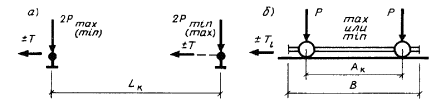 Примечания: 1. Все краны тяжелого режима работы, кроме отмеченного * - весьма тяжелый режим работы. 2. См. примеч. к табл. 1. 3. Нагрузки от кранаНагрузка от крана передается на рельс колесами в местах контакта по схеме на рисунке. Нормативные значения нагрузки для четырехколесных кранов с гибким подвесом груза определяют, кН: максимальная вертикальная Рmax - по характеристикам кранов (см. табл. 1 и 2); минимальная вертикальная - по формуле Pmin = 5 (mК + Q) - Pmax (1) принимая ее не менее 5 mК; горизонтальная, поперечная (тормозная) - по формуле Т = 0,25 (mТ + Q); (2) горизонтальная, продольная (тормозная) - по формуле Тl = 0,1 Pmax. (3)