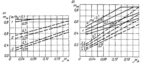 Значения тN (a) и тМ (б) при относительной толщине защитного слоя бетона а / h0 = 0,1 ¼ 0,25 и приведенном к бетону коэффициенте армирования mа = 0,02 ¼ 0,2 1 - более сжатая ветвь; 2 - менее сжатая ветвь; 3 - растянутая ветвь; 4 - изгибаемая распорка Характеристики жесткости элементов B для вычисления перемещений допускается определять приближенно: при действии продольной силы BN = mNEбAred, (2) при действии изгибающего момента BM = mMEбJred, (3) где Eб - модуль деформации бетона; Ared, Jred - приведенные к бетону геометрические характеристики железобетонного сечения; т - коэффициент, учитывающий увеличение деформативности железобетонного элемента вследствие образования трещин, значения которого принимают по рисунку. Для трещиностойких элементов m = 1. ПРИЛОЖЕНИЕ 4ОСОБЕННОСТИ ВОЗВЕДЕНИЯ И ЭКСПЛУАТАЦИИ ЭСТАКАД1. Уменьшение деформативности основанияПри выполнении строительно-монтажных работ необходимо руководствоваться общими правилами и требованиями, установленными действующими нормативными документами. При этом должны приниматься меры по уменьшению влияния начальных деформаций оснований на отклонение несущих конструкций от проектного положения в период эксплуатации, для чего следует: сообщать проектной организации обо всех обнаруженных при земляных работах отклонениях фактических грунтовых условий от принятых в проекте; обеспечивать отвод поверхностных вод с площадки во время строительства; не нарушать естественного сложения грунта под подошвой фундамента или грунтовой подушки; предотвращать замачивание основания под подошвой фундамента; не допускать промерзания основания; производить предварительную обкатку эстакады краном. Обкатка эстакады производится груженым краном в течение 5 - 6 смен непрерывной работы с таким расчетом, чтобы кран прошел над каждой колонной примерно 1000 раз. Обкатку многопролетных эстакад следует производить одновременно во всех пролетах. Окончательная выверка и закрепление крановых рельсов, а в случае необходимости - и подкрановых балок производится после окончания обкатки. 2. Требования к кранамМонтируемые на эстакаде краны должны соответствовать требованиям ГОСТ 24378-80*Е и Правил устройства и безопасной эксплуатации грузоподъемных кранов (М., 1981). В частности, следует проверять состояние ходовой части крана, влияющее на его перемещение по путям: равенство диаметров ходовых колес, отсутствие на их рабочей поверхности неровностей, степень отклонения колес от проектного положения. Для кранов пролетом 22,5 м и более, монтируемых при температуре выше +10 °С или ниже -10 °С, пролет крана следует уточнять с учетом температурных деформаций. 3. Требования к крановому путиДопускаемые отклонения в расположении крановых рельсов не должны превышать значений, указанных в табл. 1. Выполнение требований к расположению рельсов производится путем: рихтовки рельса по балке; восстановления проектного положения балок, смещаемых относительно колонны; восстановления проектного положения каркаса с помощью поддомкрачивания колонн. Рихтовка балок и колонн может производиться в пределах, предусмотренных проектом в соответствии с п.п. 4.10 и 4.11 Пособия. Таблица 1