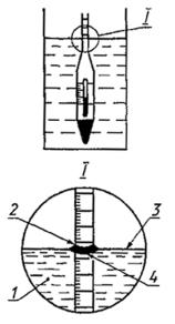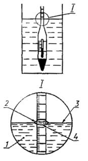 Примечание - Таблицы корректировки объема и плотности, относительной плотности (удельного веса), плотности в градусах API основаны на усредненных коэффициентах расширения типичных веществ. Так как эти коэффициенты используются в таблицах пересчета [2], поправки, введенные в том же интервале температур, приводят к минимальной ошибке, возникающей в результате возможного различия коэффициентов расширения испытуемого продукта и стандартных коэффициентов при температурах, отличающихся от 15 °С (60 °F). 6 ПРОВЕДЕНИЕ ИСПЫТАНИЯ6.1. Проверяют температуру испытуемого образца в соответствии с требованиями безопасности. Доводят цилиндр ареометра (примечание к 6.6) и термометр приблизительно до температуры испытуемого образца. 6.2. Образец переносят в чистый цилиндр ареометра, не проливая, чтобы избежать образования воздушных пузырьков и сократить до минимума испарение компонентов с более низкой температурой кипения. Высоколетучие образцы переносят в цилиндр с помощью вытеснения или сифонирования (примечание). Прежде, чем погружают ареометр, удаляют образовавшиеся пузырьки воздуха, если они собрались на поверхности образца, касаясь их чистой фильтровальной бумагой. Примечание - Образцы с высокой летучестью, содержащие спирты или другие водорастворимые вещества, переносят с помощью сифонирования. 6.3. Помещают цилиндр с образцом в вертикальном положении в место, защищенное от ветра. Следят за тем, чтобы температуpa образца значительно не менялась во время испытания; в этот период температура окружающей среды не должна изменяться более чем на 2 °С (5 °F). Если испытание проводят при температуре выше или ниже комнатной температуры, используют баню с постоянной температурой. 6.4. Аккуратно погружают ареометр в испытуемый образец. Не допускается намокание стержня выше уровня погружения ареометра в жидкость, так как жидкость на стержне влияет на показания. Образец непрерывно перемешивают термометром таким образом, чтобы ртутный столбик был полностью погружен, а стержень ареометра не намокал выше уровня погружения. Как только получена стабильная температура, ее записывают с точностью до 0,25 °С (0,5 °F) и затем удаляют термометр. 6.5. Ареометр погружают приблизительно на два деления в жидкость, а затем отпускают. При испытании маловязких образцов легким вращательным движением добиваются, чтобы ареометр не приближался к стенкам цилиндра. Выжидают, чтобы ареометр остановился, и все пузырьки воздуха поднялись на поверхность. В частности, это необходимо при испытании более вязких образцов. 6.6. Когда ареометр в состоянии покоя плавает далеко oт стенок цилиндра (см. примечание), считывают показания шкалы ареометра с точностью до 0,0001 при измерении относительной плотности (удельного веса) или плотности, или до 0,05 ° API для плотности в градусах API. Верным показанием ареометра является точка на шкале ареометра, где поверхность жидкости разделяет эту шкалу. Эту точку определяют, глядя слегка ниже уровня жидкости и медленно поднимая взгляд до тех пор, пока поверхность жидкости будет представлять эллипс неправильной формы, а затем прямую линию, разделяющую шкалу ареометра (рисунок 1). Примечание - Если используют пластмассовый цилиндр, удаляют электростатический заряд. Статическое электричество, часто образующееся при использовании таких цилиндров, может п