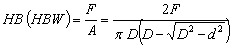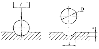 когда усилие F выражено в кгс. Твердость по Бринеллю обозначают символом НВ (HBW), которому предшествует числовое значение твердости из трех значений цифр, и после символа указывают диаметр шарика, значение приложенного усилия (в кгс), продолжительность выдержки, если она отличается от 10 до 15 с. Примеры обозначения: 250 HВ 5/750 - твердость но Бринеллю 250, определенная при применении стального шарика диаметром 5 мм, при усилии 750 кгс (7355 Н) и продолжительности выдержки от 10 до 15 с; 575 HBW 2,5/187, 5/30 - твердость по Бринеллю 575, определенная при применении шарика из твердого сплава диаметром 2,5 мм, при усилии 187,5 кгс (1839 Н) и продолжительности выдержки 30 с; При определении твердости стальным шариком или шариком из твердого сплава диаметром 10 мм при усилии 3000 кгс (29420 Н) и продолжительности выдержки от 10 до 15 с твердостью по Бринеллю обозначают только числовым значением твердости и символом НВ или HBW: например, 185 HB, 600 HBW. Обозначения параметров приведены на чертеже.
