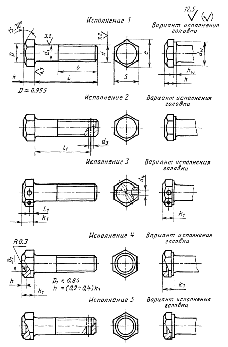 - болты исполнений 1 и 2 с высотой головки, равной k1;