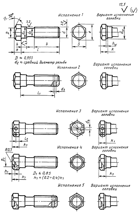 - болты исполнений 1 и 2 с высотой головки, равной k1;