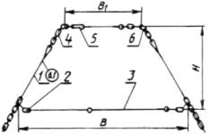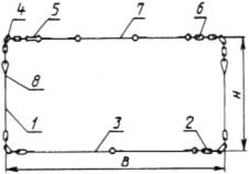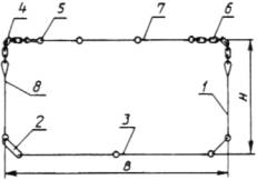 Рисунок 3 Тип 05 Рисунок 4 Условные обозначения к рисункам 1 - 4: Несущая часть: 1 - грузовая тяга; 2 - нижняя гибкая вставка или соединительное звено; 3 - нижняя несущая стяжка. Замыкающая часть: 4 - гибкий замыкающий конец; 5 - петлевой замок; 6 - верхняя гибкая вставка; 7 - замыкающая стяжка; 8 - маркировочная табличка. Примечание - Для работы с автоматическим захватом конструкция верхней угловой вставки и верхнего конца грузовой тяги должна соответствовать рабочим органам этого захвата и изготовляться по рабочим чертежам, утвержденным в установленном порядке. Таблица 1