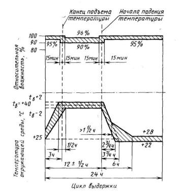 В камере устанавливают температуру (25±2) °С и относительную влажность не менее 95 %. Температуру в камере повышают в течение (3±0,5) ч до (40±2) °С. В течение этого периода относительная влажность - не менее 95 % за исключением последних 15 мин, в течение которых она должна быть не менее 90 %. На образцах в этот период должна конденсироваться влага. В камере поддерживают температуру (40±2) °С в течение (12±0,5) ч от начала цикла при относительной влажности (93±3) %, за исключением первых и последних 15 мин, когда она должна быть от 90 до 100 %. В течение последних 15 мин на образцах не должно быть конденсации влаги. Температуру в камере понижают до (25±3) °С в течение 3-6 ч при относительной влажности не менее 95 %, за исключением первых 15 мин, когда она должна быть не менее 90 %. Скорость снижения температуры в течение первых 1,5 ч должна быть такова, что если бы температура снижалась с этой скоростью до (25±3) °С, указанная температура могла бы быть достигнута за 3 ч±15 мин. Допускается проводить снижение температуры до (25±3) °С за 3-6 ч без дополнительного требования для первых 1,5 ч, а относительную влажность при этом поддерживать не менее 80%. Затем в камере поддерживают температуру (25±3) °С и относительную влажность не менее 95 % до конца цикла. 6.7. Обработка результатов - по п. 1.7. 6.8. Протокол испытаний - по п. 1.8. 6.9. Требования безопасности - по п. 1.9. 7. МЕТОД ИСПЫТАНИЙ ПРИ НЕПРЕРЫВНОМ ВОЗДЕЙСТВИИ СЕРНИСТОГО ГАЗА БЕЗ КОНДЕНСАЦИИ ВЛАГИ7.1. Сущность метода заключается в ускорении коррозионного процесса при воздействии сернистого газа. 7.2.Метод не допускается применять для определения коррозионной стойкости никеля и его сплавов, никелевых покрытий, а также для получения сравнительных данных по защитной способности микротрещинных и микропористых хромовых покрытий. Метод применяют для испытаний покрытий из драгоценных металлов, исключая серебро и его сплавы. 7.3. Отбор образцов - по п. 1.2, при испытании образцов с покрытиями из драгоценных металлов их форму и размеры оговаривают в программе испытаний. 7.4.1. Испытательная камера с герметичной дверцей, объемом не менее 0,3 м3, должна обеспечивать испытательный режим (температуру и относительную влажность испытательной среды, концентрацию сернистого газа) с отклонениями, установленными в настоящем стандарте. Камера, изготовленная из материалов, стойких к воздействию сернистого газа, должна иметь: устройство для ввода газа извне, которое расположено на высоте не менее 50 мм от дна камеры и обеспечивает равномерность поступления его, а также не допускает прямое попадание струи газа на образцы; устройства для отбора проб и удаления отработанного газа из камеры с последующей нейтрализацией его; устройство для контроля температуры, установленное в верхней части камеры. Его температурный датчик устанавливают в камере на расстоянии 150 мм от верхней части и дверцы и 250 мм от стенки. Поток газовоздушной смеси в полезном объеме камеры должен обеспечить 3-5-кратный обмен в час. Заданную относительную влажность воздуха в камере создают подачей воздуха, увлажненного дистиллированной водой. 7.4.2. Баллон со сжиженным сернистым газом или аппарат Киппа по ГОСТ 25336-82. 7.4.3. Газоанализатор типа ГКП-1. Кислота серная концентрированная по ГОСТ 4202-77, ч.д.а.,. 10 %-ный раствор. Натрий сернистокислый по ГОСТ 195-77. Вода дистиллированная по ГОСТ 6709-72 или деионизированна