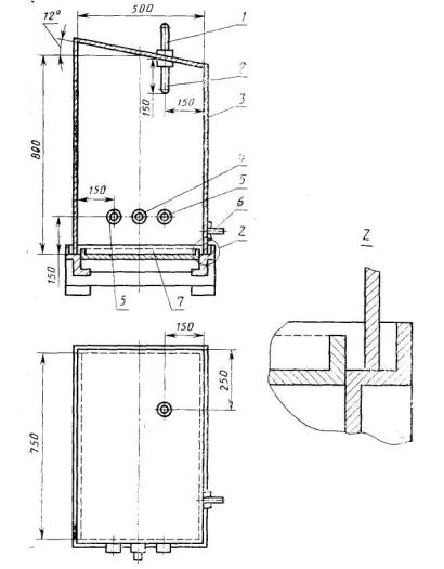 1 - термометр; 2 - точка измерения температуры; 3 - кожух; 4 - отверстие для присоединения предохранительного клапана; 5 - отверстия для контактного термометра: 6 - патрубок для ввода газа; 7 - поддон с водой |